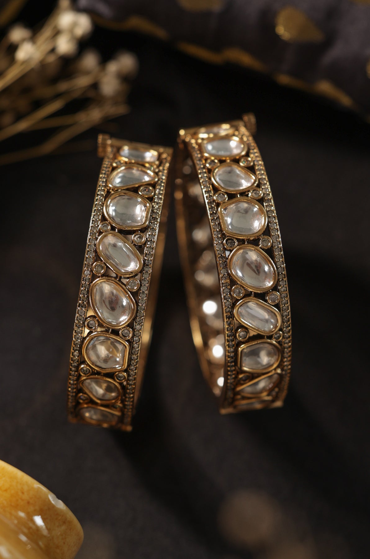 These Zora bangles embody timeless elegance with a touch of regal charm. Crafted with bold uncut stones set in antique gold frames, each bangle reflects a rich heritage and artisanal craftsmanship. The inner edge is adorned with fine micro-crystals, adding a delicate shimmer that complements the natural beauty of the Polki stones. Their balanced design and intricate texture make them ideal for weddings, festive celebrations, or meaningful gifts. Elegant and steeped in tradition, these bangles are not just accessories but cherished keepsakes in the making.