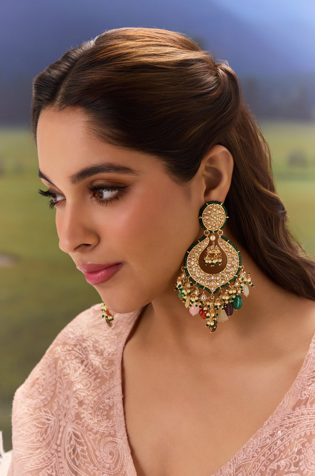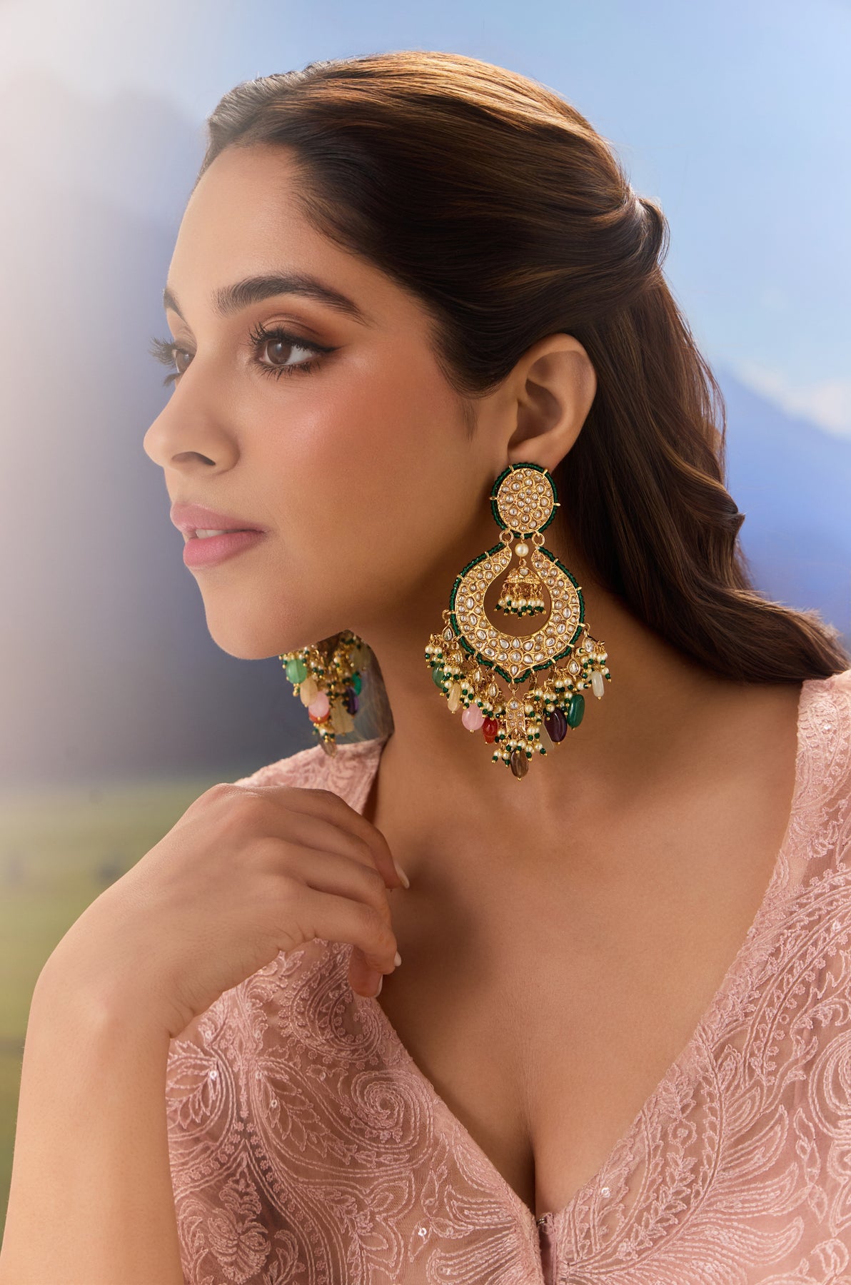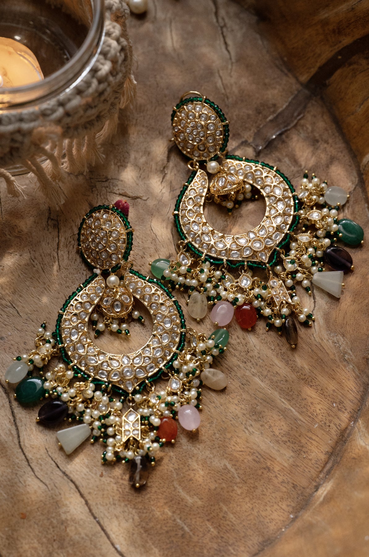 These exquisite chandbali earrings showcase intricate craftsmanship with vibrant multicolored stones in kundan work into a gold-plated silver alloy foundation. Each piece features delicate beadwork in emerald green that accentuates the ornamental design, creating a sophisticated interplay of traditional artistry and contemporary elegance. Perfect for elevating both festive and formal occasions with timeless appeal.