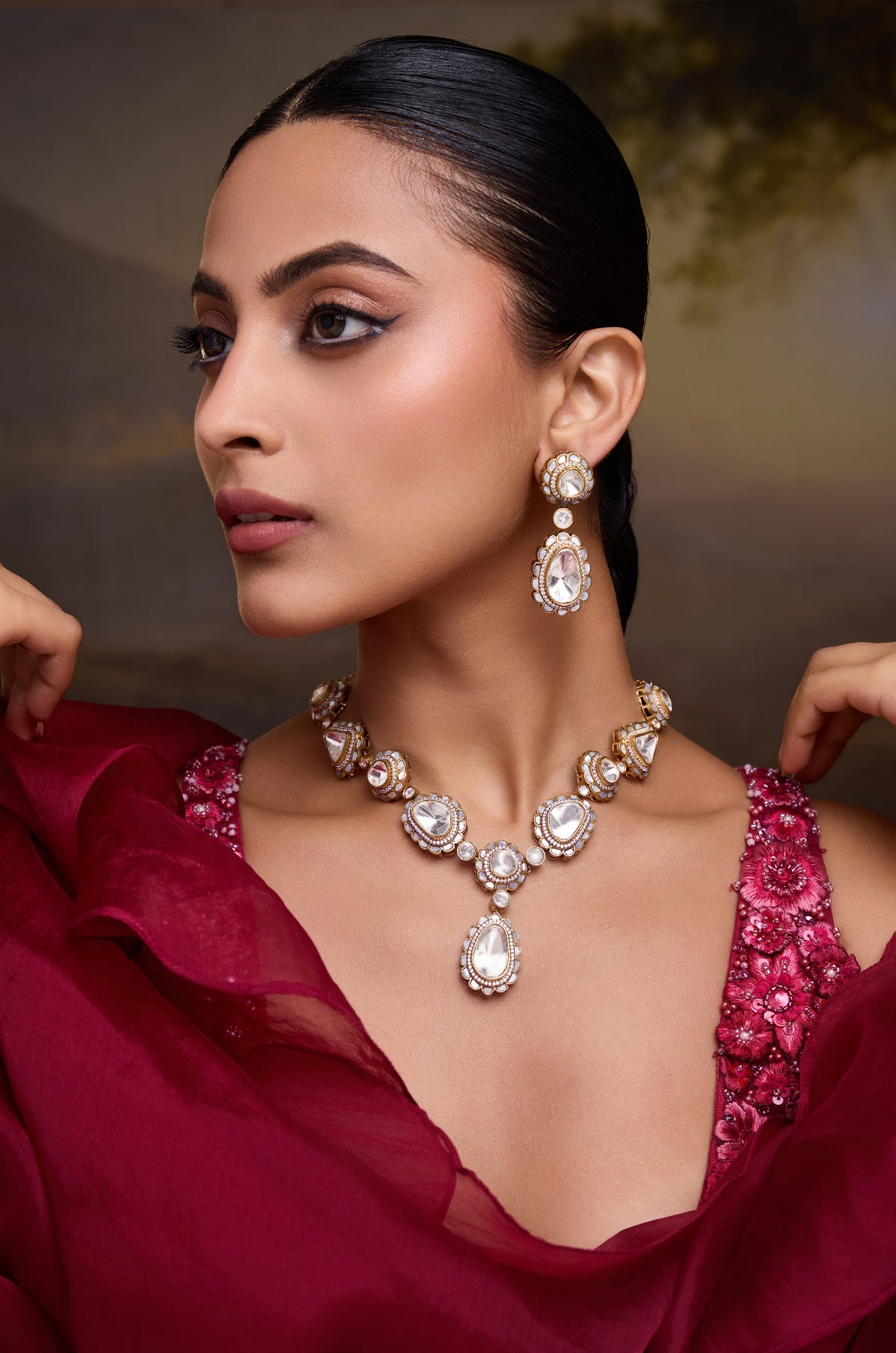 This exquisite necklace set exudes timeless elegance and refined luxury. Featuring shimmering teardrop-shaped polkis, each framed by intricate mother-of-pearl scalloping, it captures the essence of vintage glamour. The triple-drop design flows elegantly along the neckline, reflecting light with subtle brilliance. Complemented by matching earrings, this set is a perfect statement of sophisticated charm.
