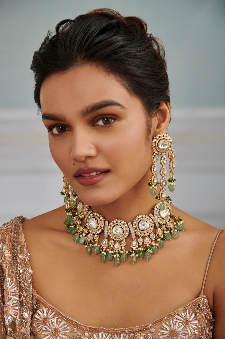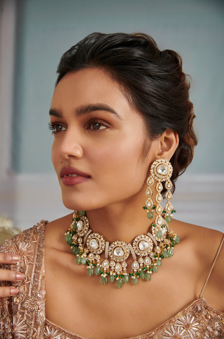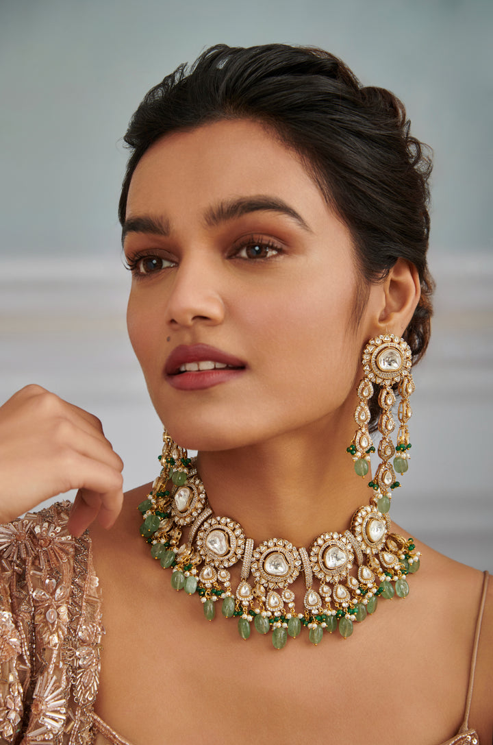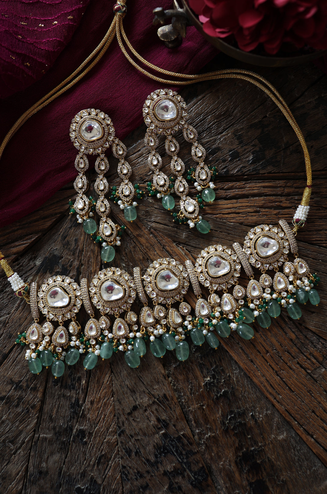 Experience the stunning elegance of this exquisite necklace, decorated with shimmering polki and enhanced with the luminous shine of cubic zirconia. The delicate mint fluorite stones bring a burst of refreshing color, reminiscent of blooming spring. The addition of pearls and green hydro stones adds a touch of delicacy to the necklace. Complete with coordinating drop earrings, this set exudes sophistication and charm, bestowing a queenly aura upon the wearer.