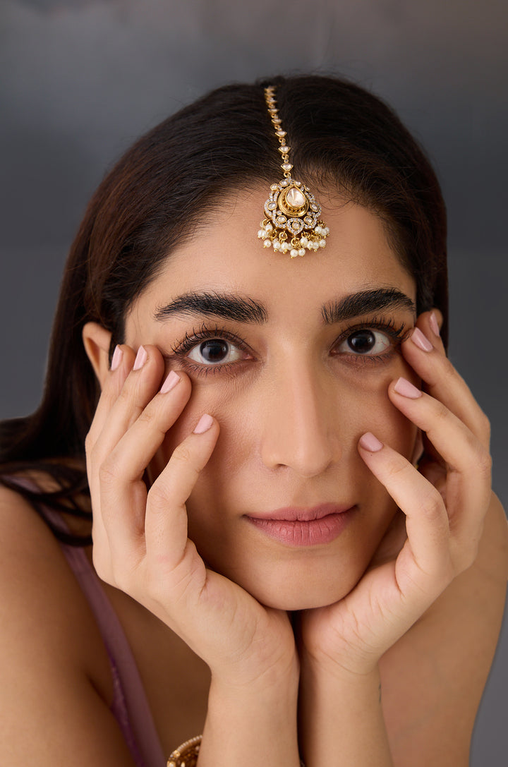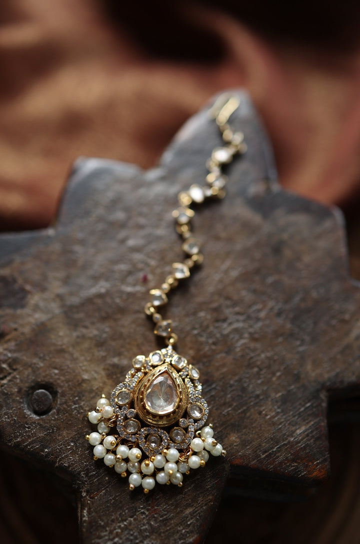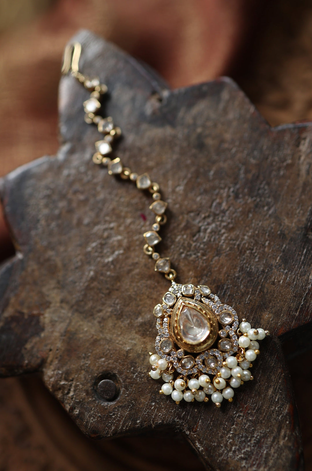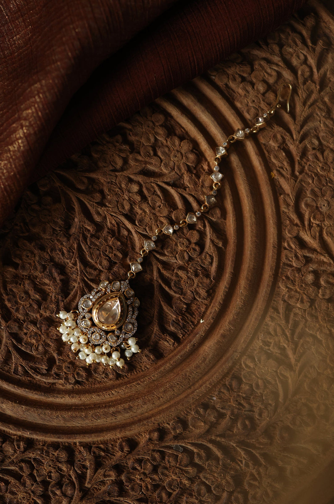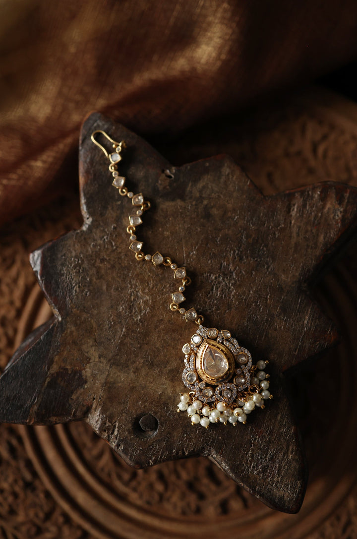 This Isha maangtikka features fine silver and expert artisanship, embellished with dazzling moissanite polki and cubic zirconia. Ideal for formal events, it is a valuable piece to pass down through generations, making it a timeless treasure in your jewelry ensemble.