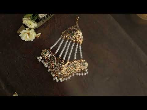 Elevate your look with the Mahir jhoomar. This exquisite headpiece features a stunning combination of green and red hues, accented with lustrous pearls that dangle gracefully from its base. Impeccably crafted, this jadau passa exudes luxury and sophistication. Complete your ensemble with this sophisticated and exclusive accessory.