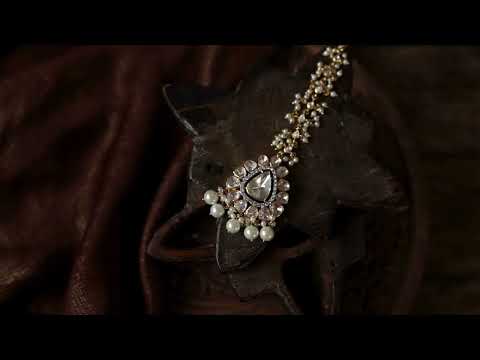 The Seanea maangtikka showcases fine silver and exquisite craftsmanship, adorned with lustrous moissanite polkis and pearls. Perfect for special occasions, this maangtikka is heirloom-worthy, making it a timeless addition to your jewelry collection.
