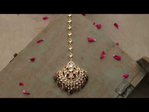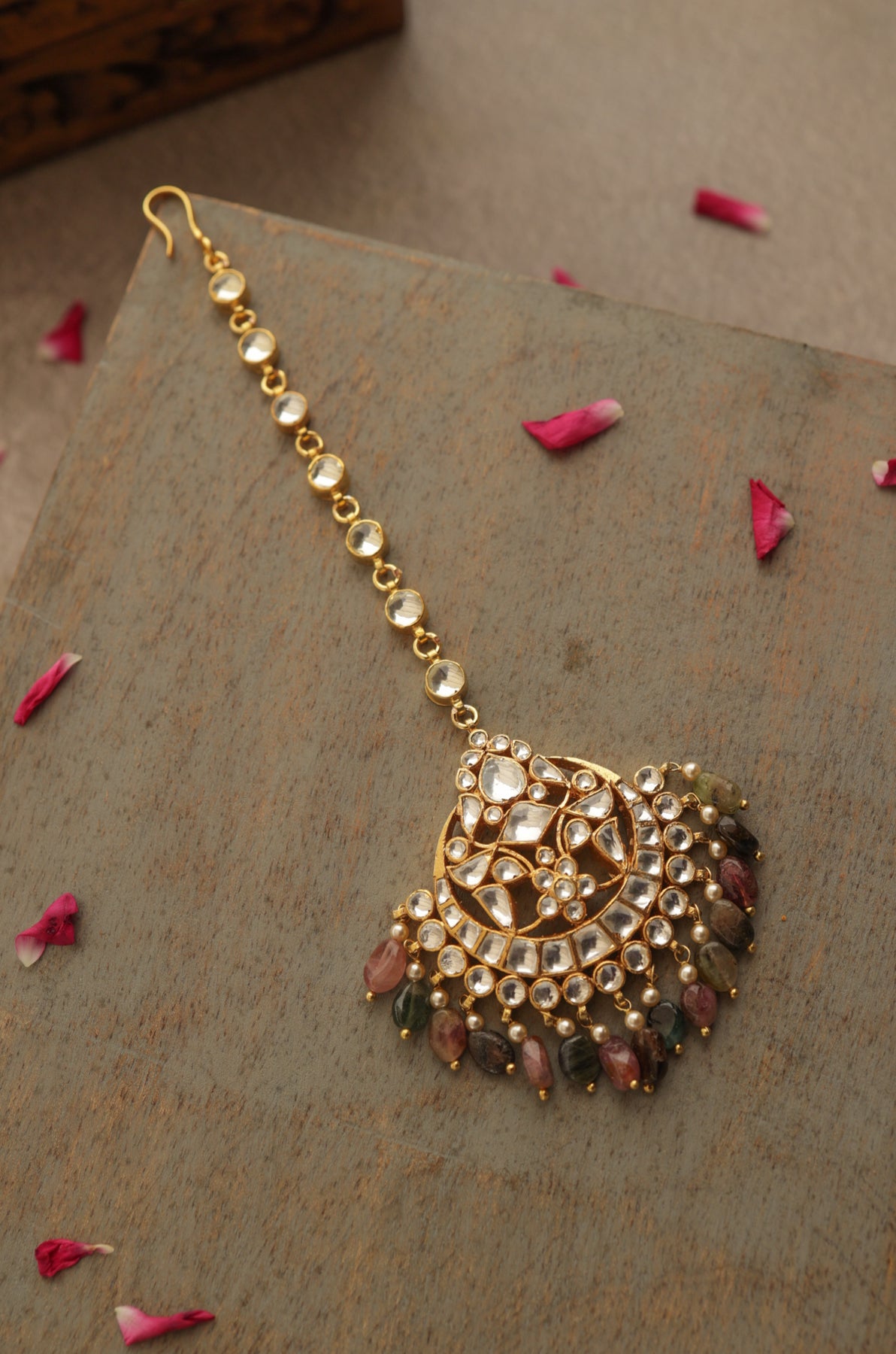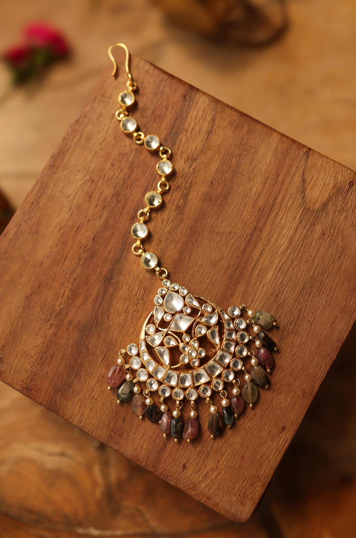A celestial whisper graces the forehead with Shazia Maangtikka. The intricate, starburst design at its center, meticulously crafted with shimmering kundan, evokes a sense of cosmic wonder. From this radiant focal point, a delicate chain of perfectly aligned kundan extends, designed to grace the hair's parting with subtle elegance. The multicolored stone hangings sway gently, scattering light in a kaleidoscope of colors. A masterpiece of detail, this maangtikka illuminates the beauty of its wearer with a touch of magic.