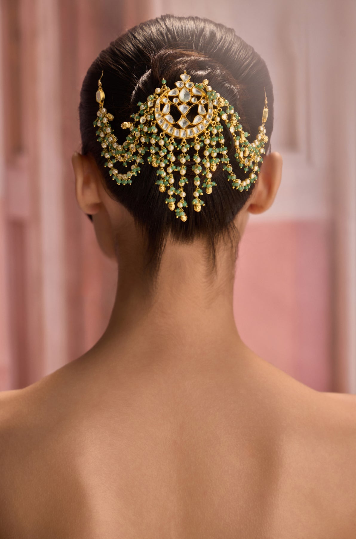 The Ivin braid pin is a versatile piece that effortlessly enhances any hairstyle. The ornate centerpiece, adorned with sparkling kundan and captivating mint hydro stones, adds a touch of glamour. The delicate kundan string ensures a comfortable and secure fit, making it a perfect accessory for all occasions.