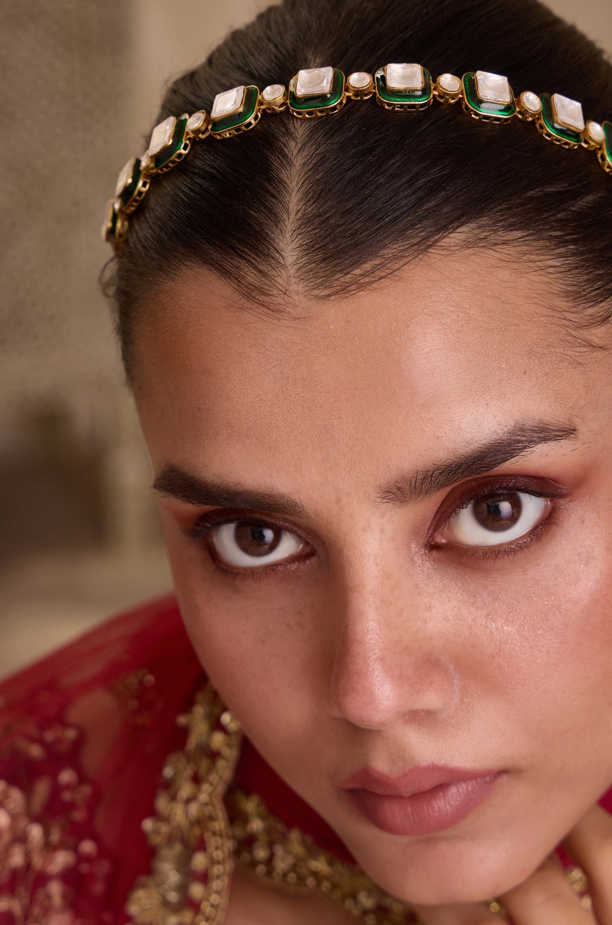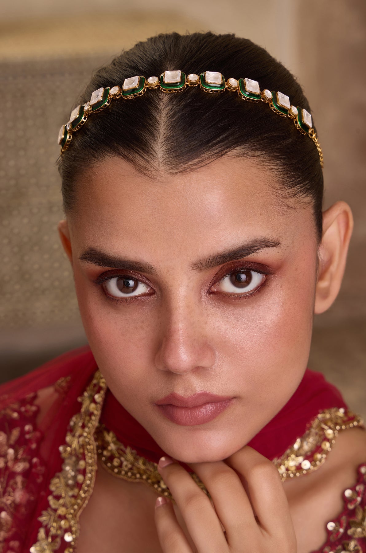 The Samaira headband is a vision of understated royalty, featuring exquisite polki stones framed with rich green enamel detailing. Each stone is delicately set in gold-toned alloy, creating a seamless line of elegance across the crown. Minimal yet regal, this versatile headpiece brings a graceful touch to bridal and festive looks, making it a timeless treasure for your jewel box.