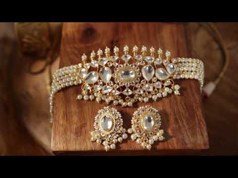 This exquisite Inayat choker set pays tribute to enduring elegance, reminiscent of regal times past. Its centerpiece shines with uncut, mirror-polished stones, each set in detailed goldwork that reflects the grandeur of royal treasures. Soft strands of radiant pearls gently encircle the neck, offering a beautiful balance of refinement and splendor. Complemented by matching earrings that echo its luxurious design, this set is crafted for the contemporary woman inspired by vintage charm. Ideal for weddings or special occasions, it is a piece that leaves a lasting impression.