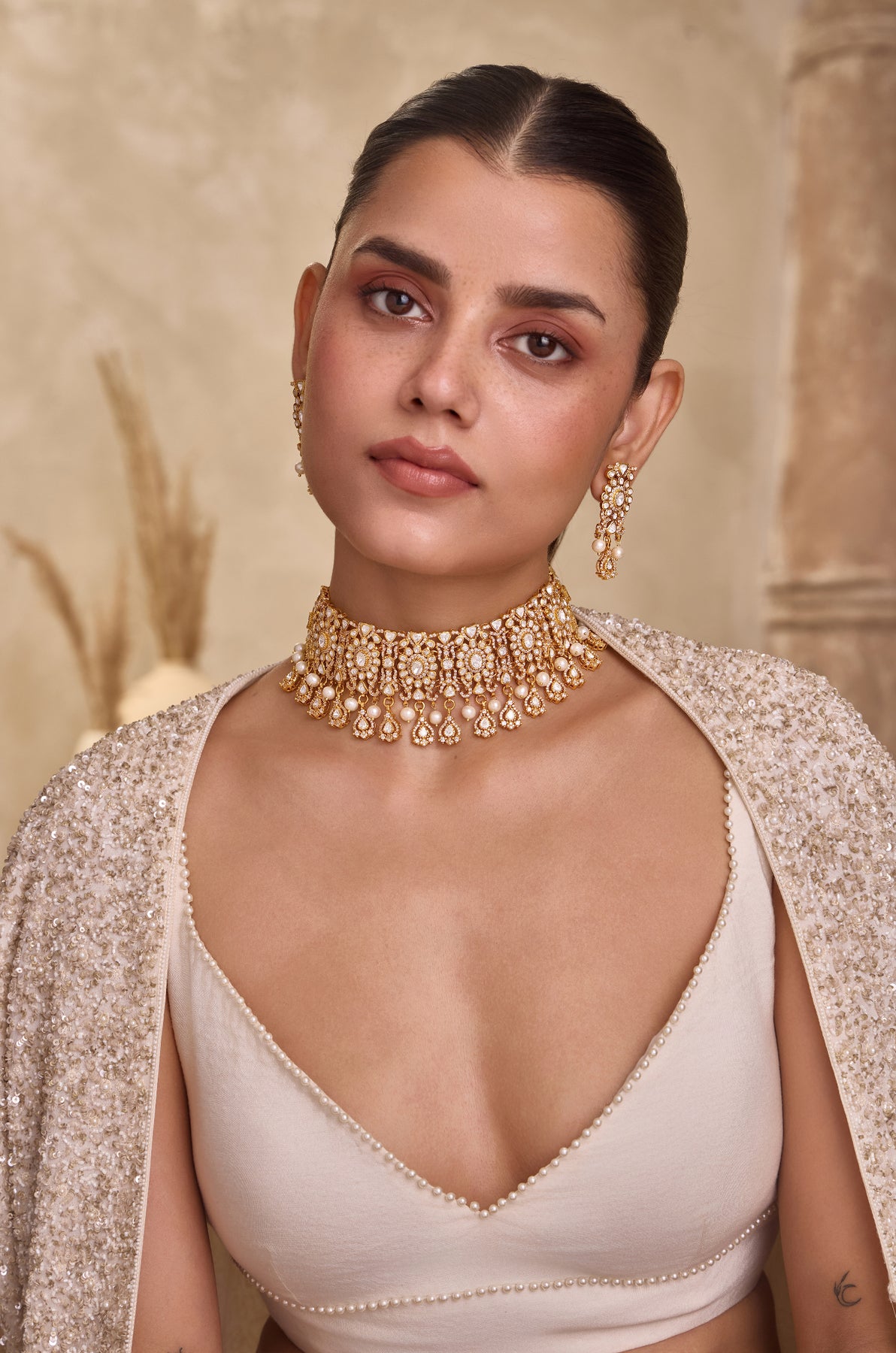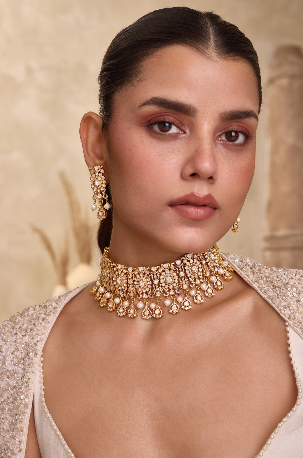 Exemplifying flawless craftsmanship, the Kaia necklace set is a majestic creation, expertly handcrafted from fine silver and adorned with brilliant moissanite polki stones. Its detailed floral designs are complemented by subtle pearl drops, delivering a refined blend of sophistication and splendor. A distinguished piece destined to become a treasured heirloom, passed down through generations.