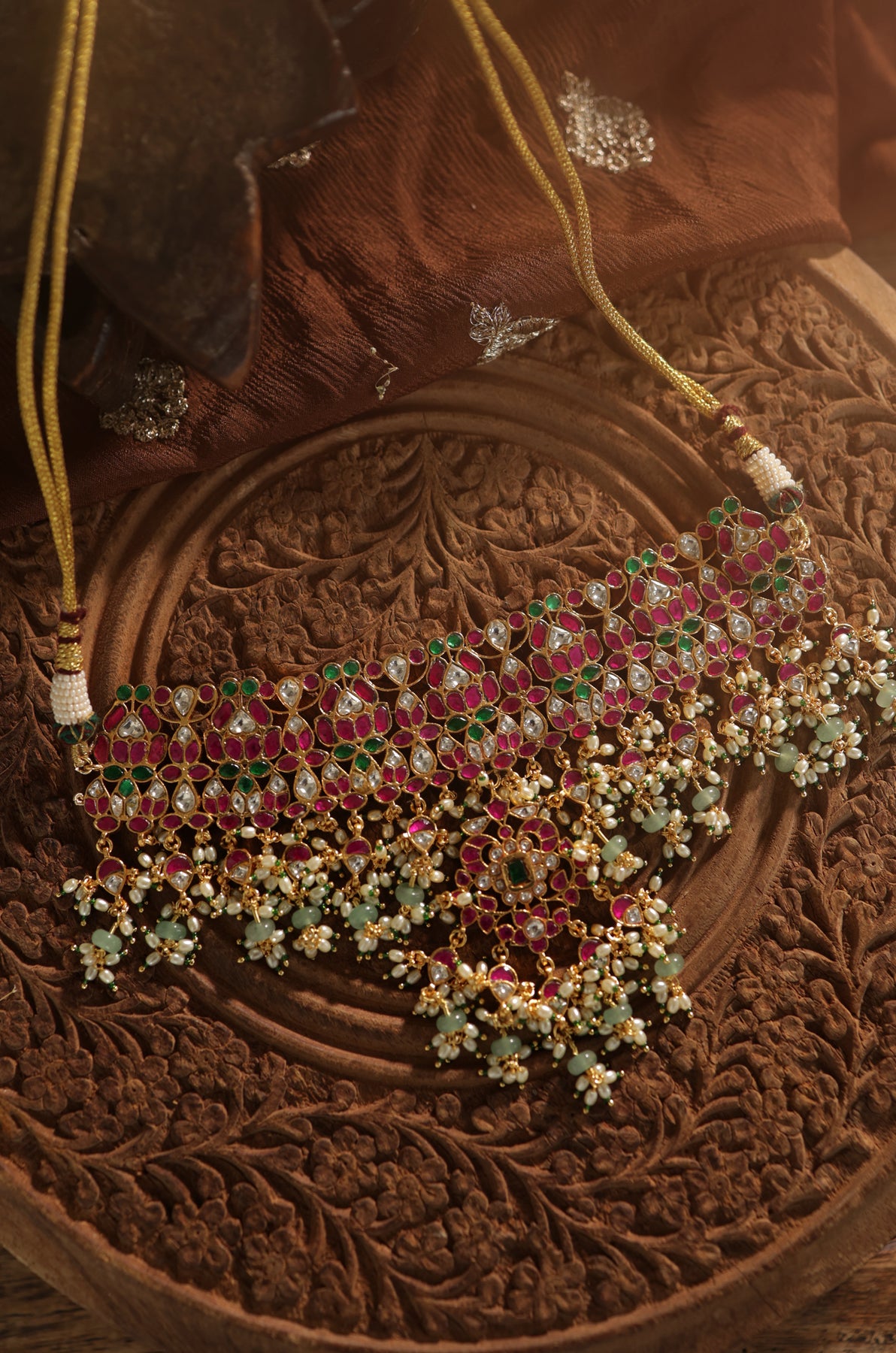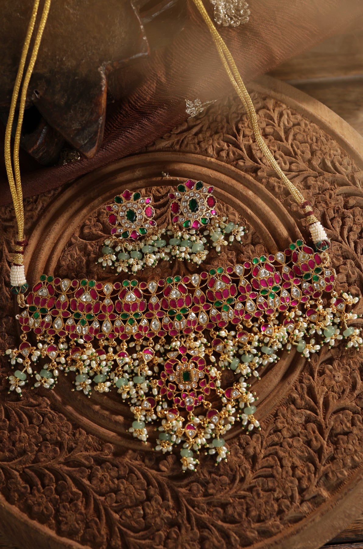 Immerse yourself in regal grandeur with the Rajasi Kundan Necklace Set, exquisitely handcrafted in fine silver. Adorned with vibrant kundan work, this masterpiece features a stunning interplay of deep ruby reds, lush emerald greens, and shimmering kundan stones, all set in intricate floral motifs. Cascading drops of pearls and gemstone beads add graceful movement, while the matching earrings complete the ensemble with timeless charm. A true heirloom creation, Rajasi captures the splendor of royal traditions, making it a statement piece for weddings and festive occasions.