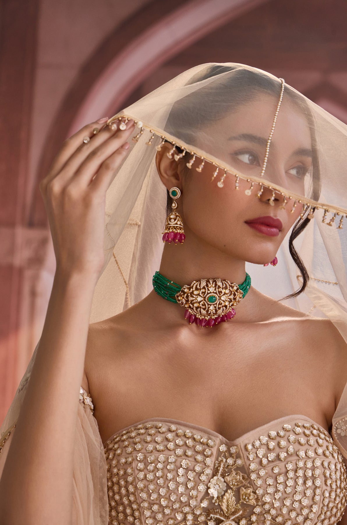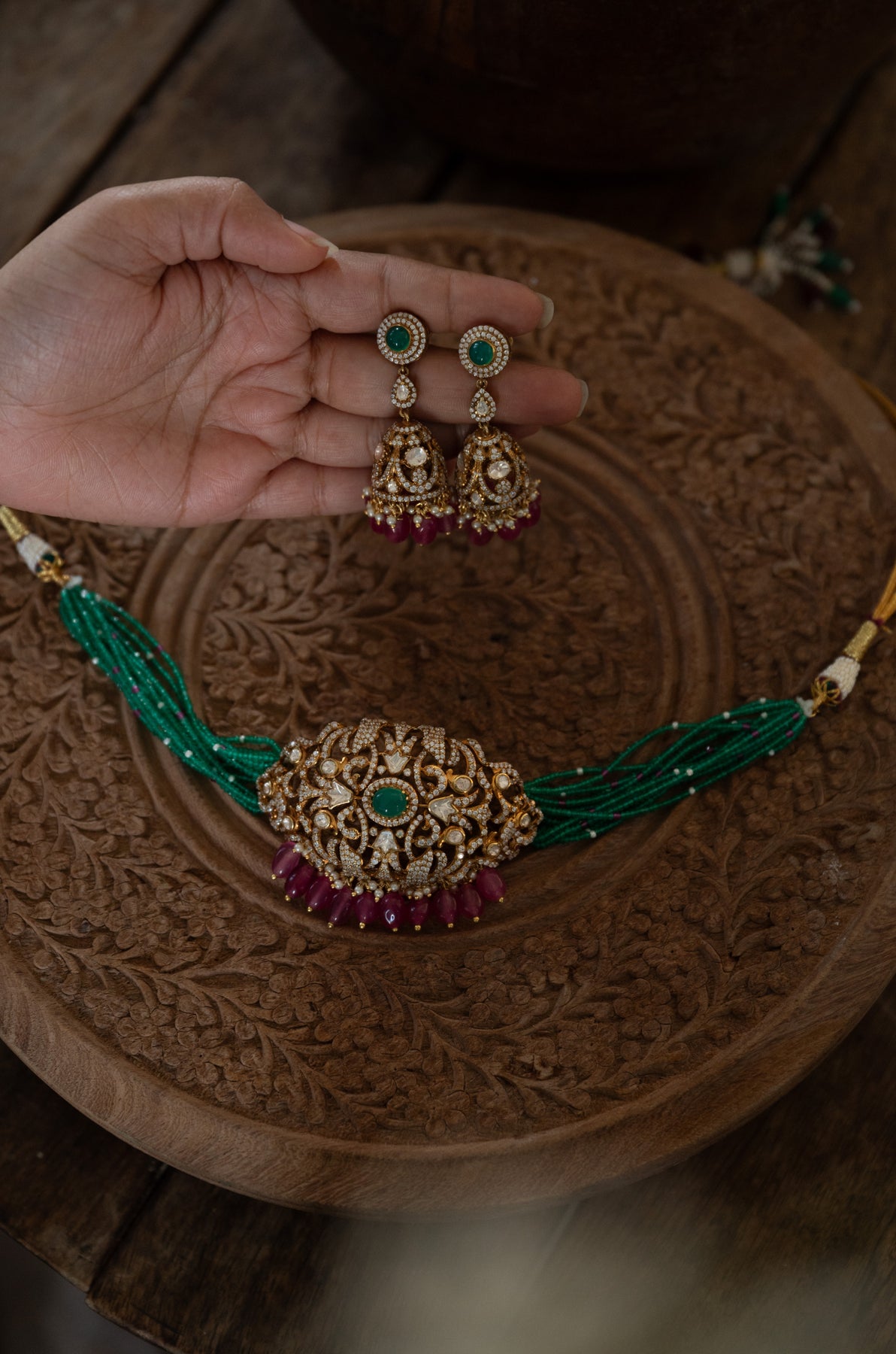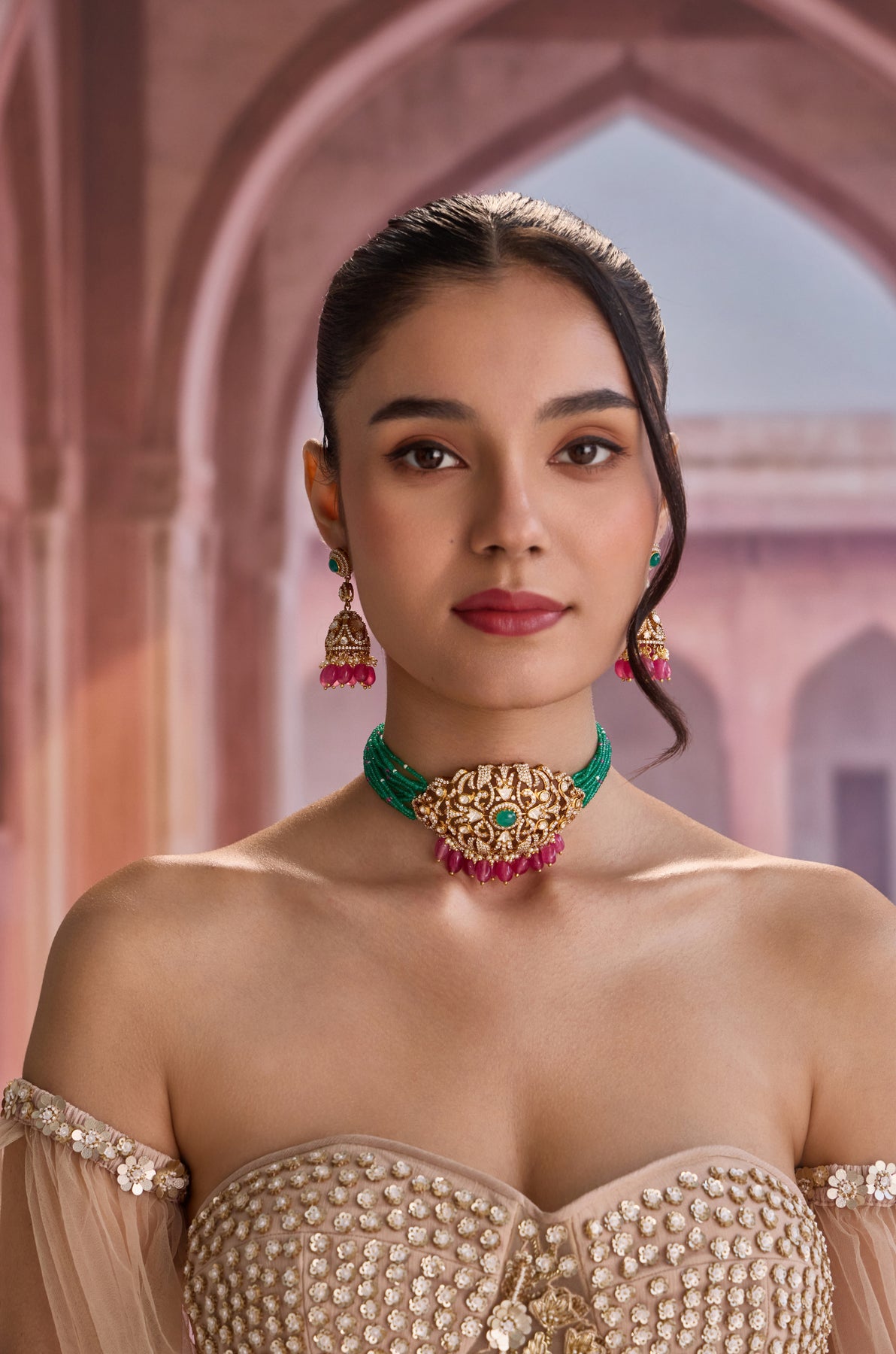 A captivating blend of heritage craftsmanship and contemporary elegance, this choker set is designed to make a refined yet striking statement. The centerpiece showcases intricate polki work, beautifully arranged in an ornate floral-inspired motif, highlighted with a rich emerald stone at its heart. Strung with multiple layers of deep green beads, the necklace brings a fresh vibrance while maintaining a regal aesthetic. The design is further enhanced with ruby-toned drops and delicate detailing, adding movement and a hint of drama. Paired with matching jhumka-style earrings featuring emerald accents and fine polki work, this set is perfect for festive occasions, weddings, or elevated traditional styling. A timeless piece that effortlessly blends color, craftsmanship, and elegance