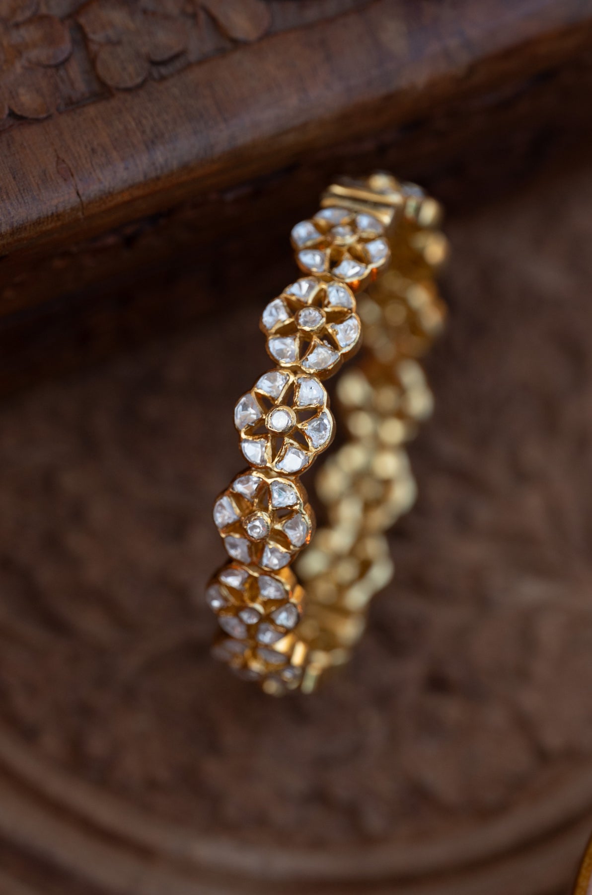 Walia bangle is a timeless treasure crafted with traditional artistry and contemporary brilliance. This heirloom-worthy piece features lab-created moissanite set in sterling silver, combining the sparkle of polki with ethical craftsmanship. The delicate polki work showcases intricate floral patterns, honoring centuries-old jewelry-making traditions. Each bangle is handcrafted with meticulous attention to detail. A piece meant to be treasured and passed down through generations.