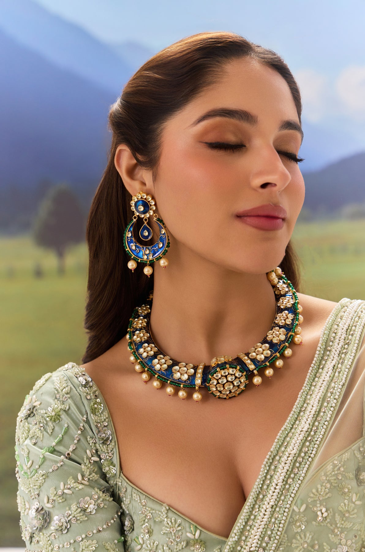 Elevate your traditional collection with this distinctive Jereen Hasli Necklace Set, reimagined through expert craftsmanship. The piece showcases luminous meenakari detailing in striking blue and green tones, complemented by authentic polki stones and lustrous shell pearls. Each element is thoughtfully layered to create dimensional depth and visual intrigue. This contemporary interpretation of a classic silhouette bridges heritage and modern aesthetics, making it an exceptional choice for those who appreciate nuanced jewelry design and timeless elegance.