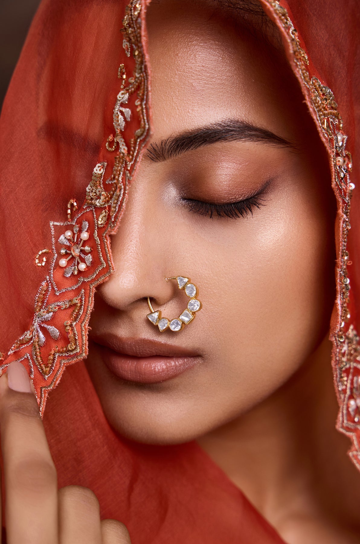 A whisper of heritage and a mark of quiet strength, the Sonam nosepin is an ode to timeless grace. Crafted in a delicate crescent form, this minimal yet striking nosepin is adorned with hand-set polki , each reflecting a raw, uncut brilliance that speaks of regal tradition. The bold geometry of the stones paired with the soft gold frame creates a poetic balance perfect for the bride who treasures simplicity with soul. A true heirloom in spirit, the Sonam is where vintage charm meets modern allure.