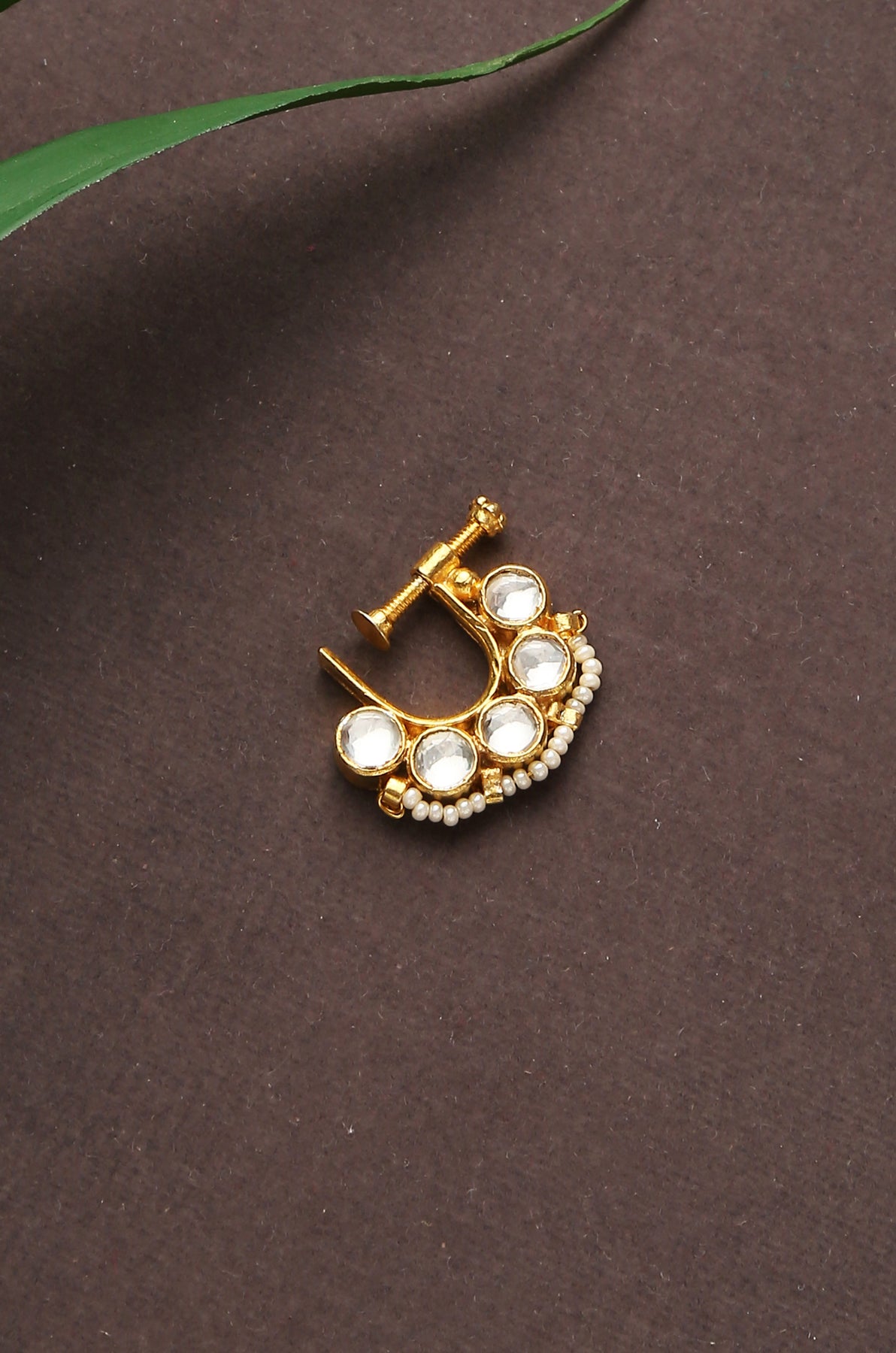 Crafted with refined sophistication, this Umra nosepin showcases exquisite kundan work enhanced by lustrous pearl accents. Each piece exemplifies traditional artisanal craftsmanship, delivering a timeless accessory that elevates your aesthetic with understated luxury and graceful detailing.