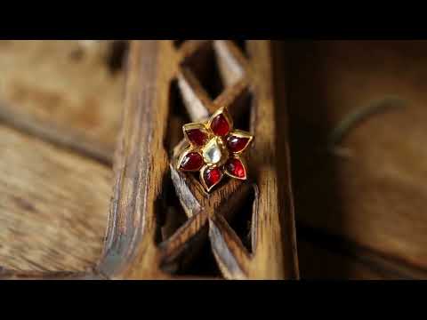 Professionally designed with a classic aesthetic, the Vedhi kundan nosepin showcases a subtle yet intricate floral motif adorned with red kundan. Its understated design adds a touch of sophistication to any ensemble. Enhance your appearance with this exquisitely crafted nosepin.