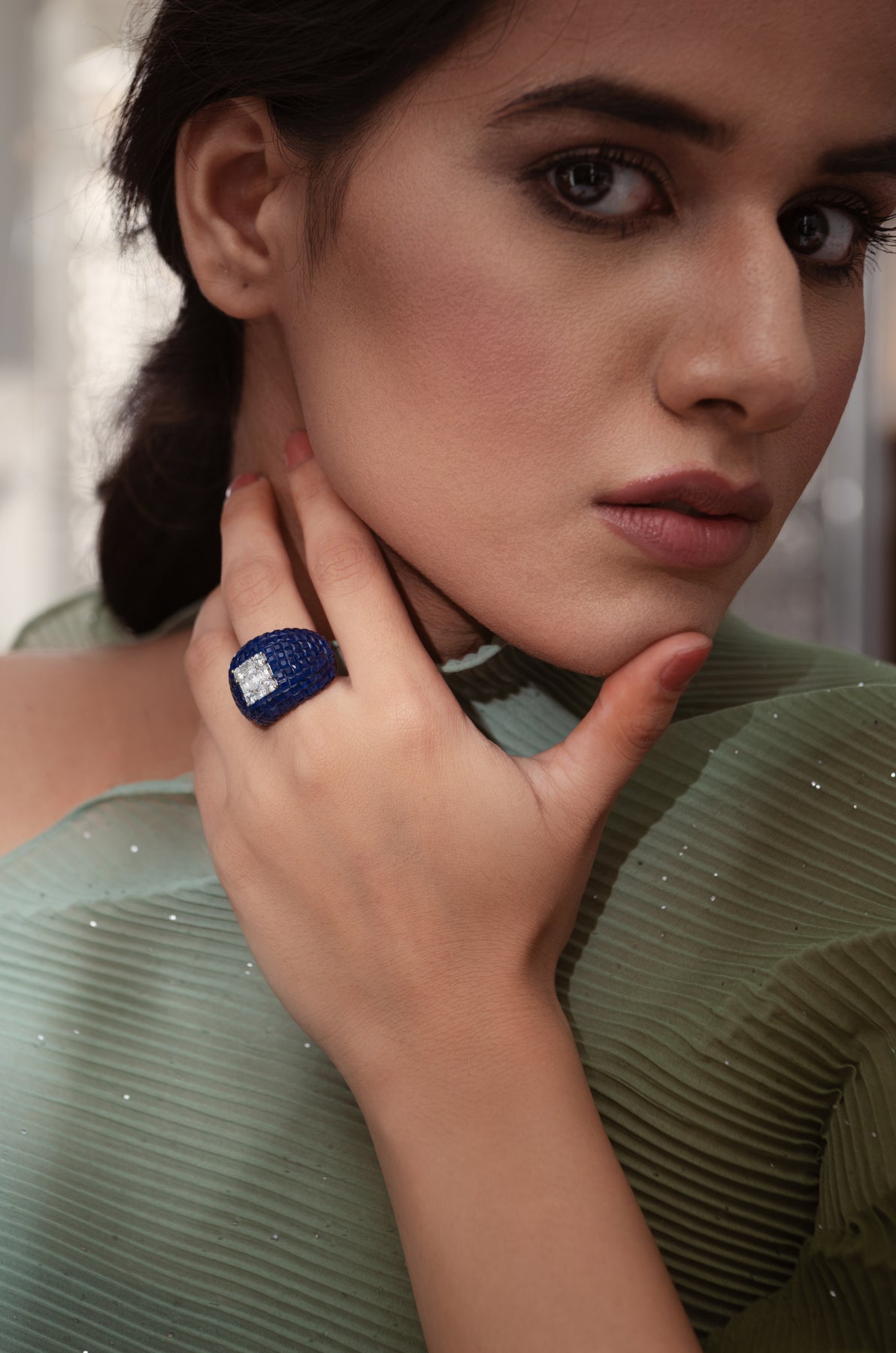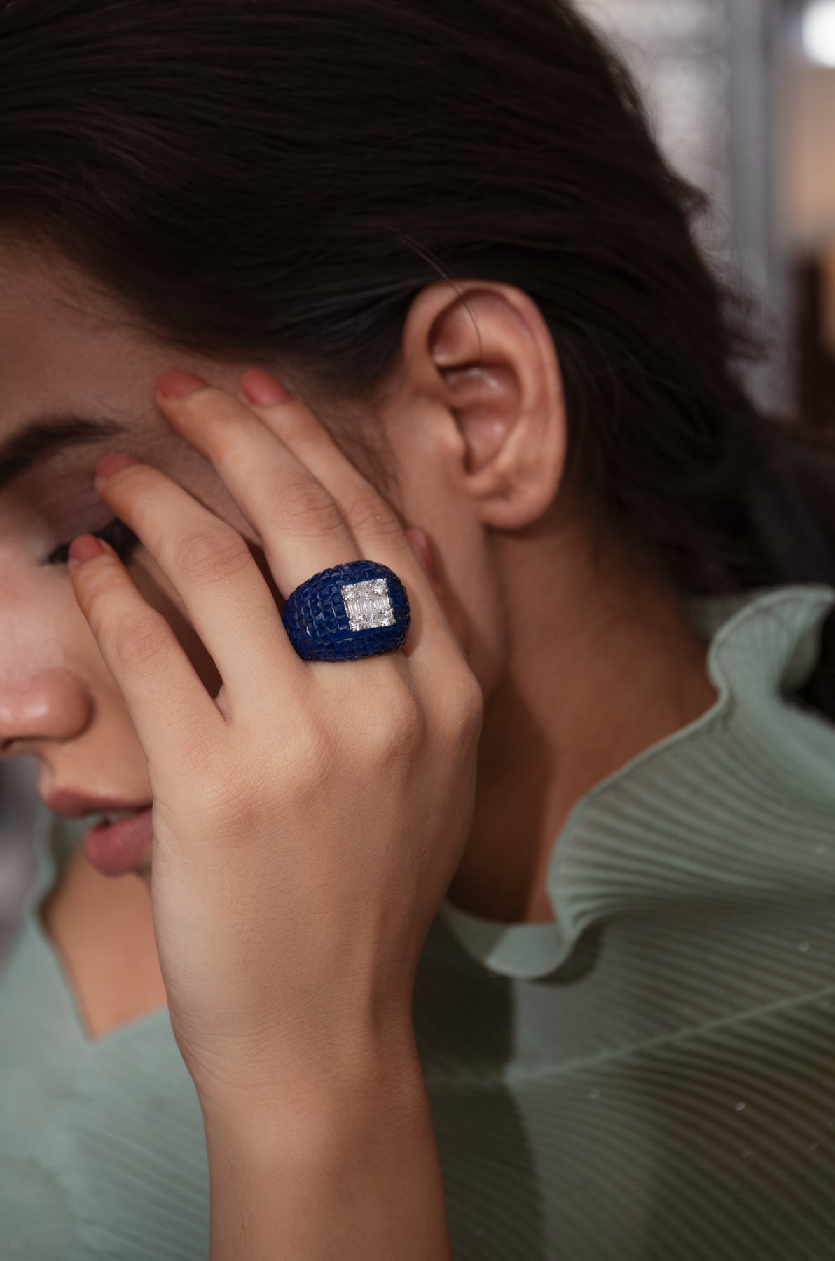 The ring features a vibrant blue crystals surrounded by a halo of sparkling cubic zirconia stones. The expertly crafted design creates a truly eye-catching effect, perfect for making a statement. The blue crystal adds a pop of color and sophistication, while the cubic zirconia encrusting provides a luxurious touch.