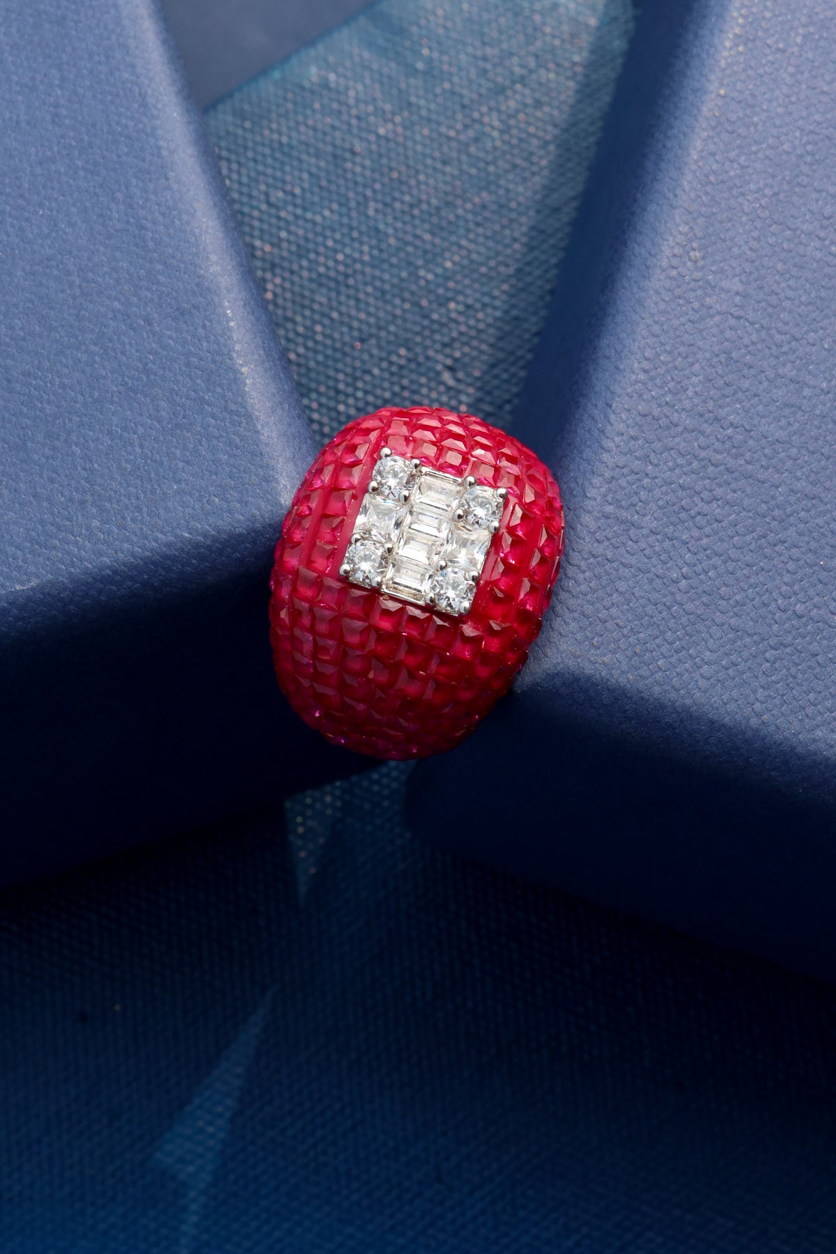 The ring features vibrant pink crystals surrounded by a halo of sparkling cubic zirconia stones. The expertly crafted design creates a truly eye-catching effect, perfect for making a statement. The pink crystal adds a pop of color and sophistication, while the cubic zirconia encrusting provides a luxurious touch.