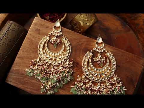 Inspired by rich Indian heritage and culture, these oversized chandbali earrings are a testament to exquisite craftsmanship. The classic design, adorned with sparkling kundan, exudes a sense of regal sophistication. The mint stone and pearl hangings add a touch of drama, making them a statement piece that complements any ensemble with understated elegance.