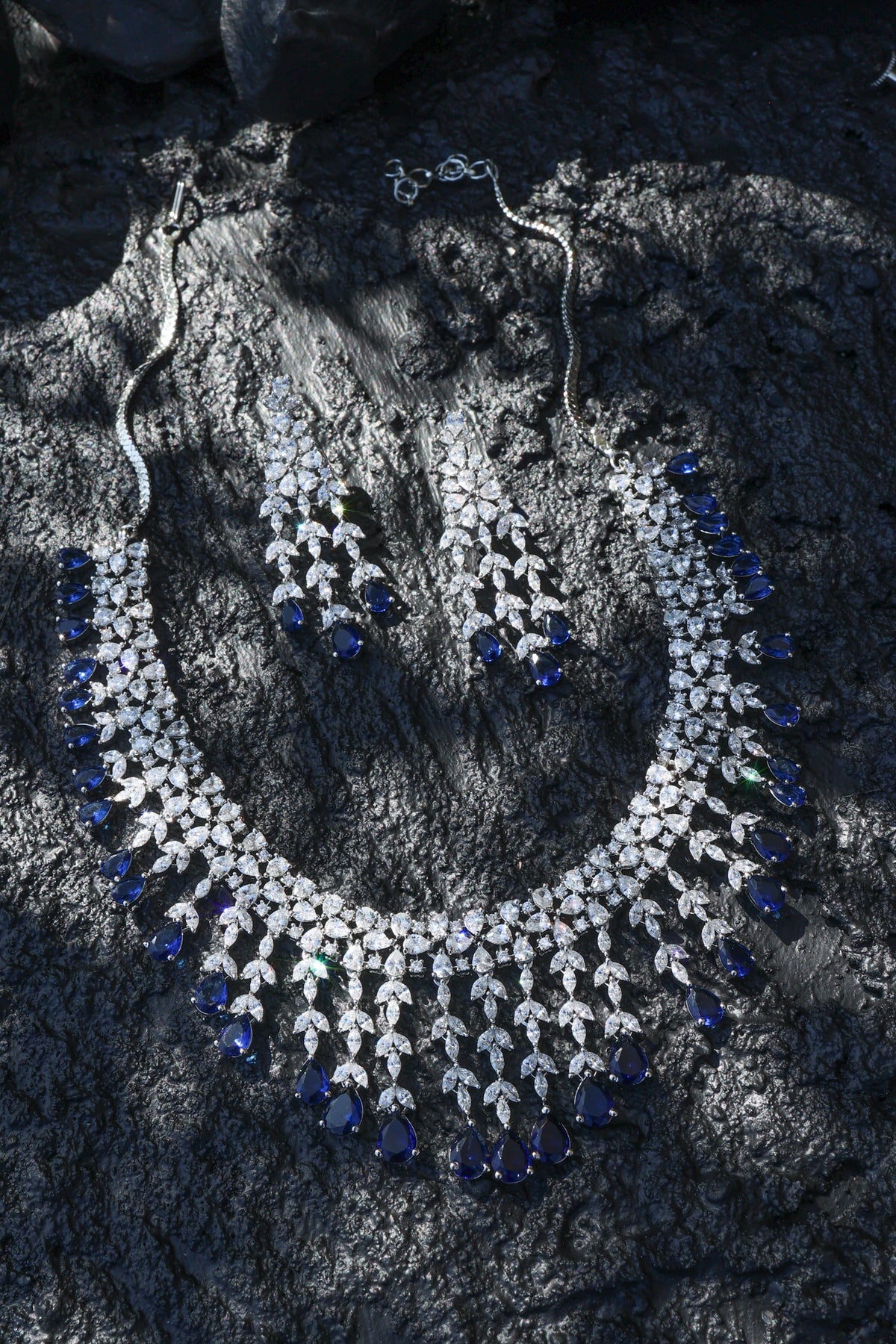 Featuring zircons for a touch of glamour and teardrop-shaped blue crystals, this set is designed to add a sophisticated sparkle to any outfit. The matching earrings perfectly complement the necklace, ensuring a cohesive and elegant look.
