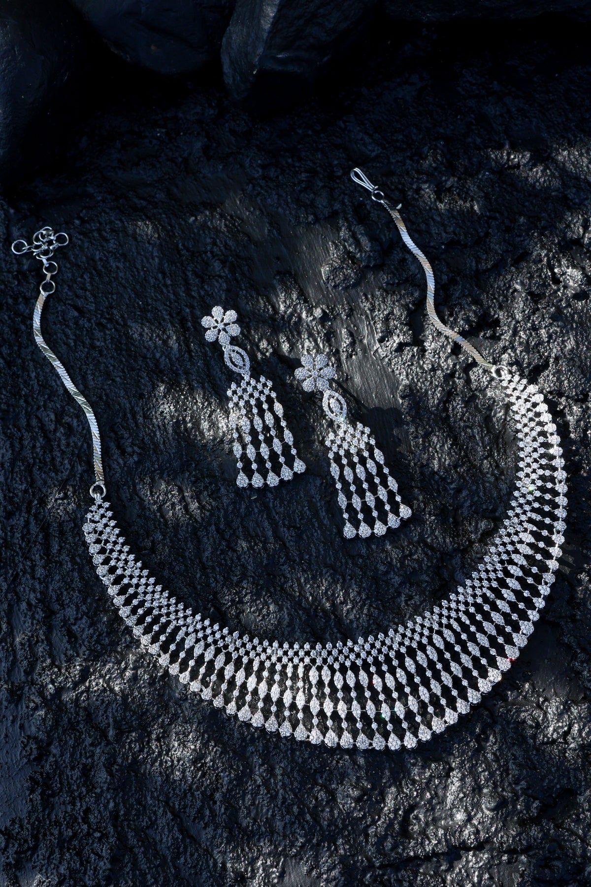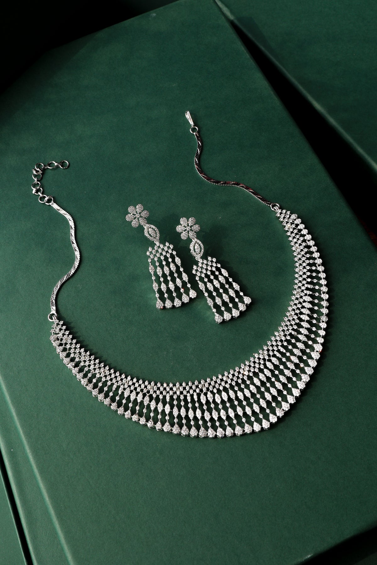 This set features shimmering cubic zircon that elevate its glamorous appeal. The matching earrings complete the look, ensuring a cohesive and sophisticated style. Add a touch of sparkling elegance to your wardrobe and elevate your outfit with this refined and versatile combination.