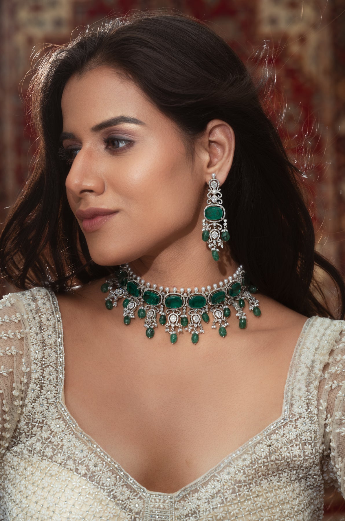 Enhance your outfit with the Artistry green choker necklace set. The striking green stones, accompanied by cubic zirconia and green crystals, result in a modern and bold design. Pair it with the matching earrings to complete your ensemble and elevate your fashion sense.