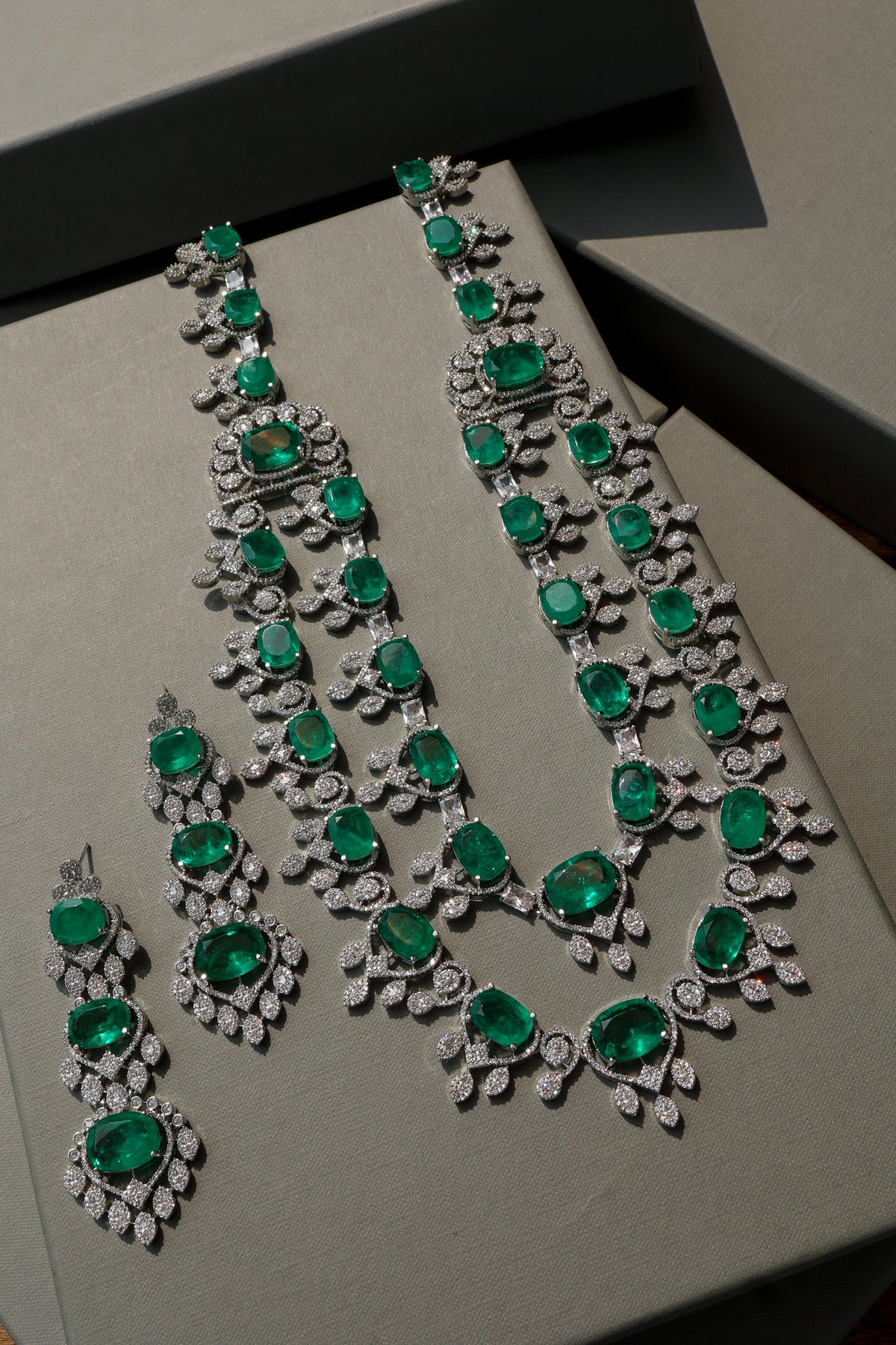 This stunning layered necklace features sparkling green crystals, accented with encrusted cubic zirconia for an extra touch of glamour. Complete the look with the matching earrings for a truly show-stopping ensemble.