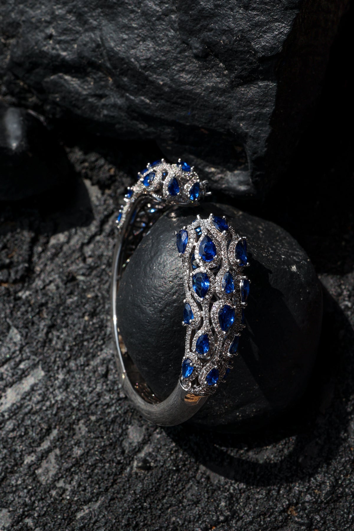 Make a dramatic statement with this show-stopping cuff bracelet, encrusted with sparkling cubic zirconia and vibrant blue crystals. Its chic and elegant design is elevated by a unique twist, setting it apart from the ordinary