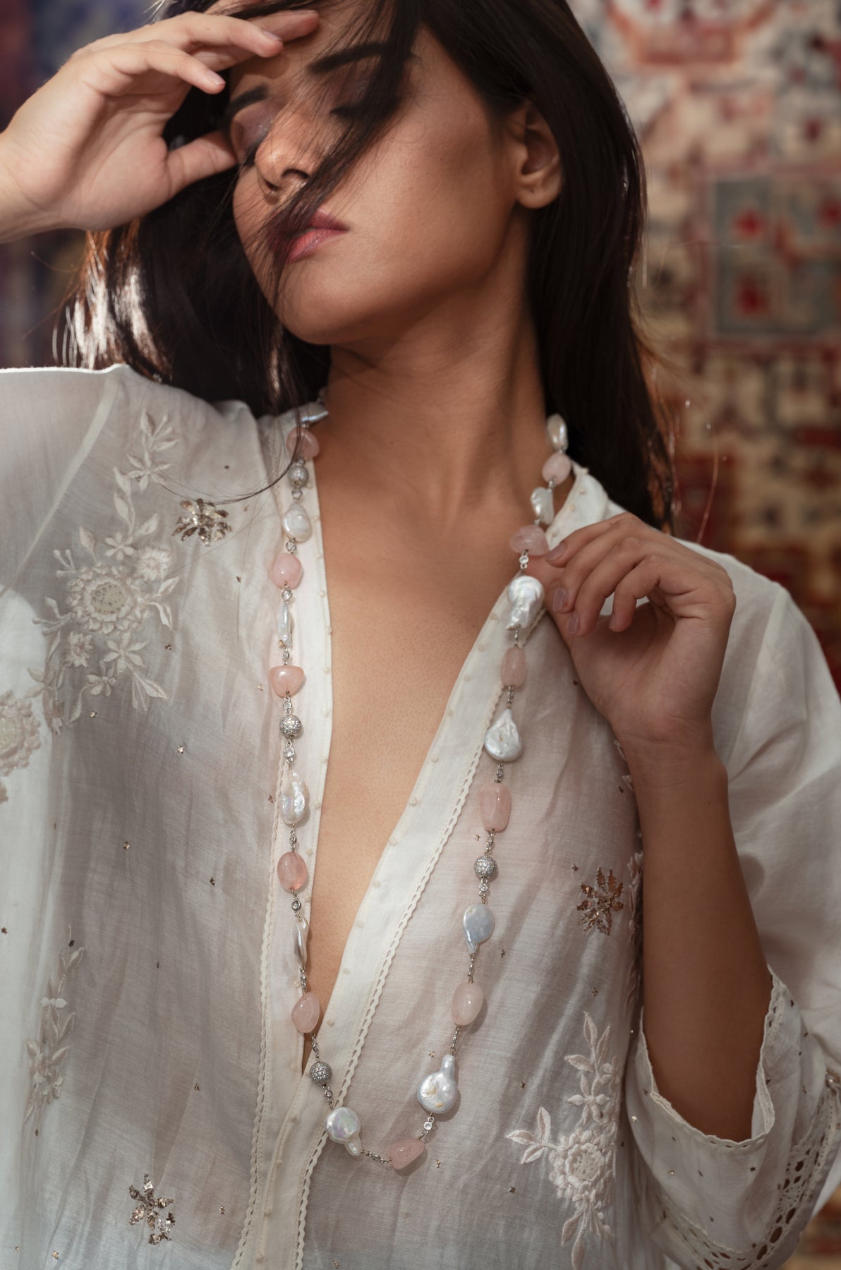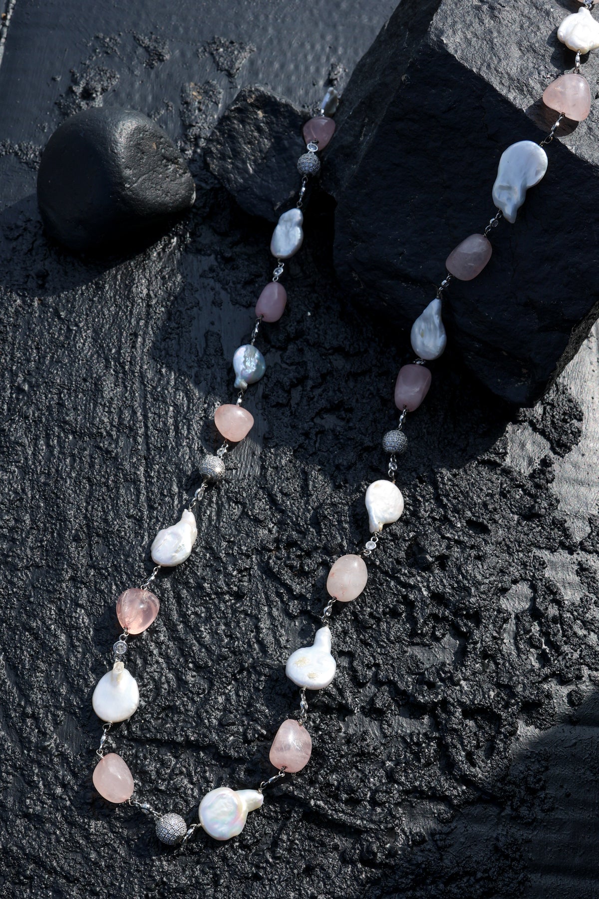Embrace effortless elegance with Hestia necklace, featuring a beautiful combination of pearls and vibrant pink quartz. The design flows gracefully, making it the perfect accessory for your everyday look. With its bohemian charm, this necklace adds a touch of artistic flair to any outfit.