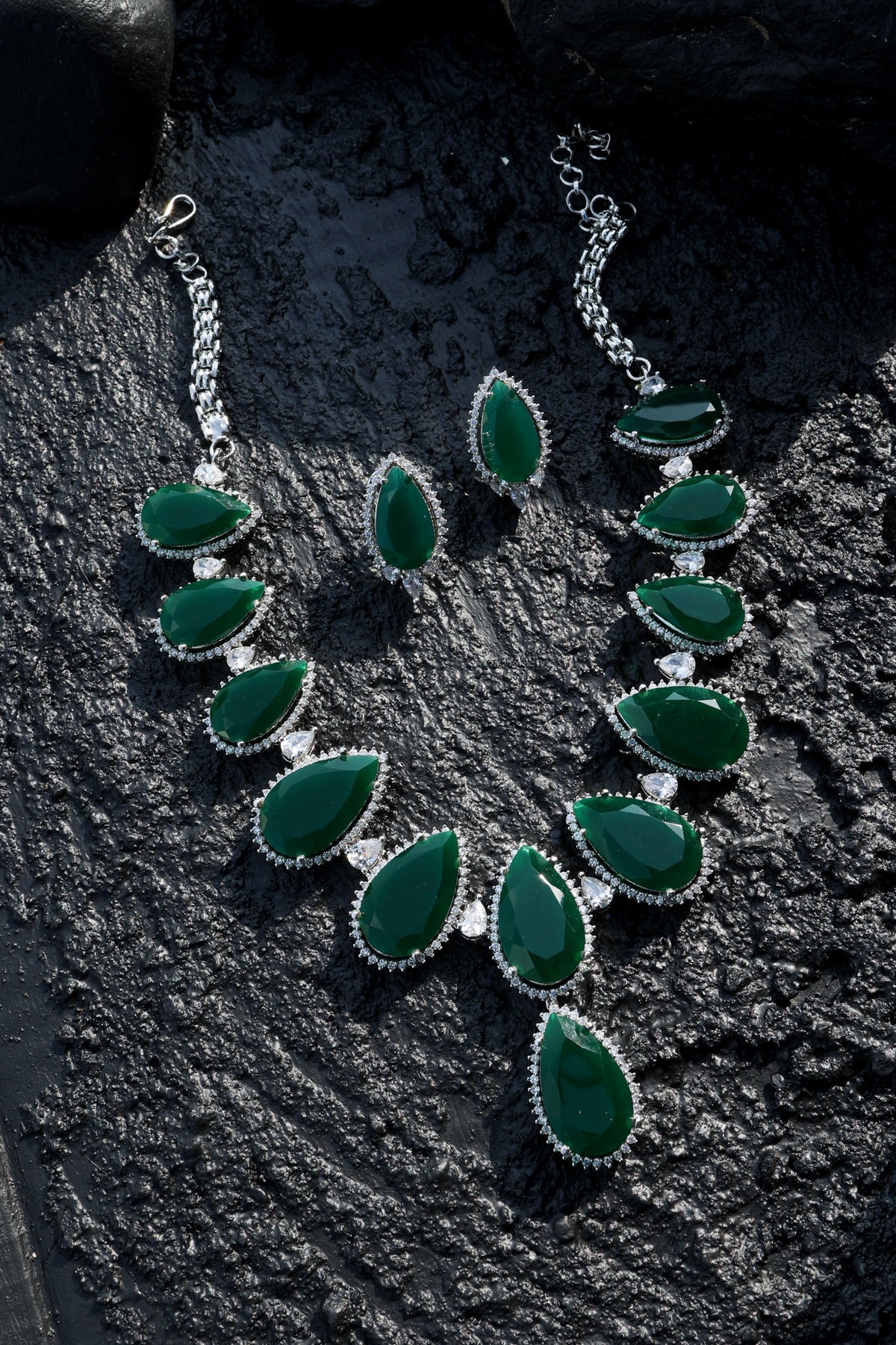 The glistening zircons add a touch of timeless elegance, while the fiery green stones bring a vibrant pop of color, creating a captivating contrast. Perfect for any occasion, this set is completed with matching earrings, ensuring a cohesive and stylish finish to your look.