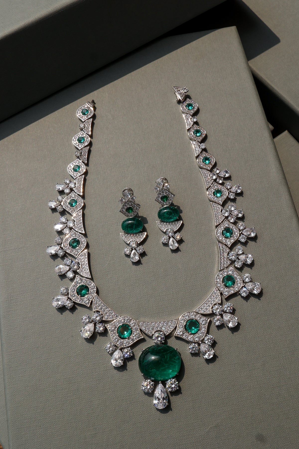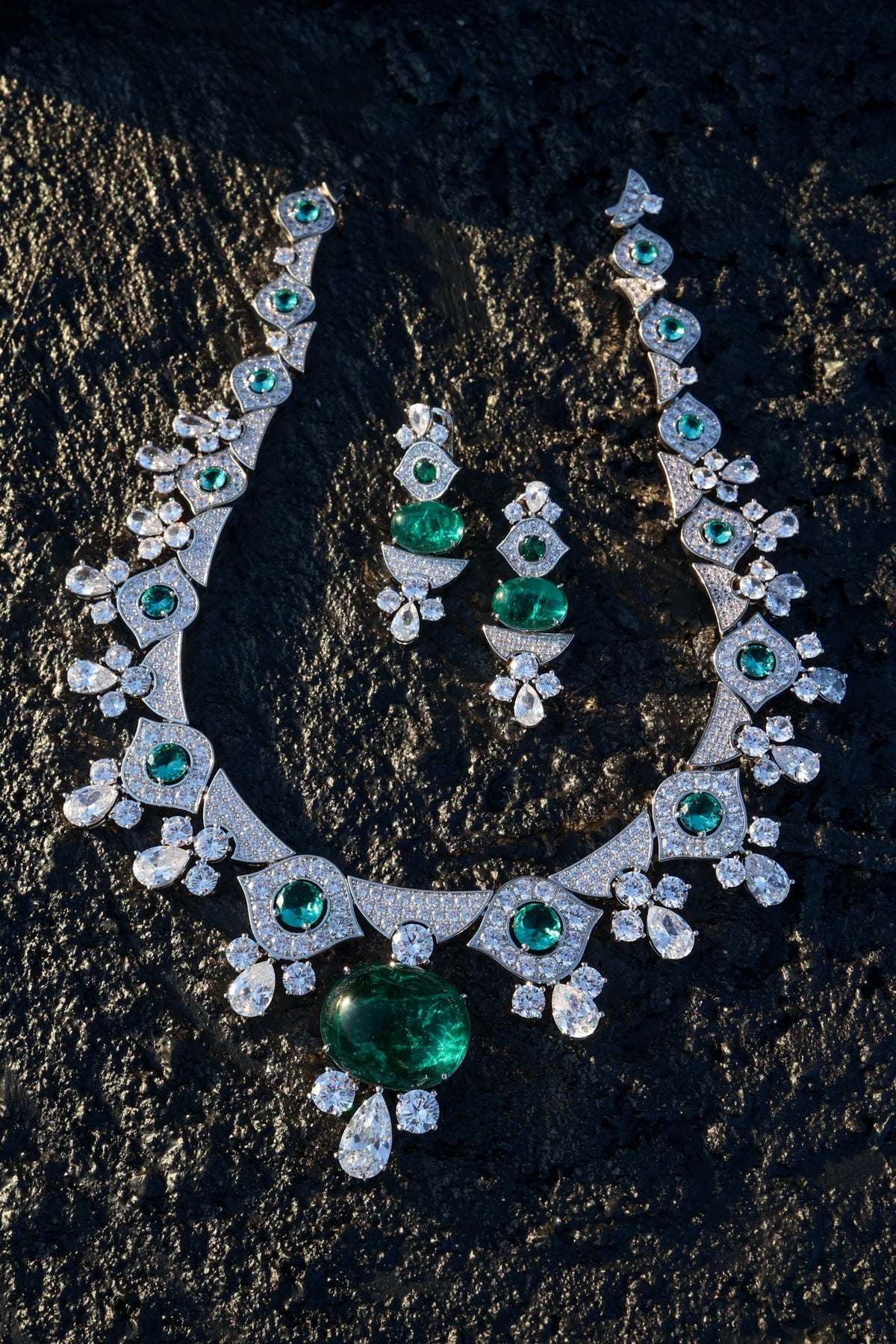 Make a bold statement with our stunning Julian necklace set. At its heart lies a stunning giant mint stone, radiating elegance and charm. Cascading below, faux diamond teardrop hangings add a touch of sparkle and sophistication. Accompanied by matching earrings that mirror the necklace's design, this set beautifully enhances any outfit.