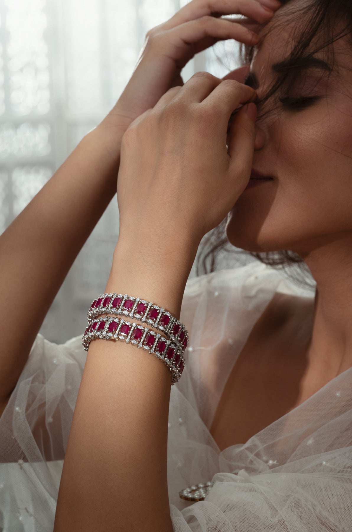 Upgrade your fashion sense with these stunning bangles, featuring a modern design that expresses a sense of contemporary sophistication. Adorned with shimmering cubic zirconia and vibrant pink crystals, they flawlessly combine refinement and allure, elevating any ensemble to a whole new level.