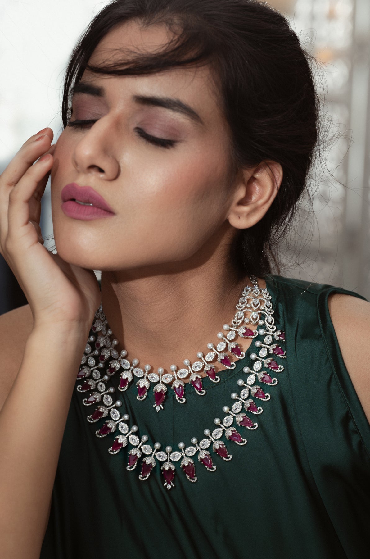 The Poppy necklace set is inspired by the delicate beauty of spring flower buds. This exquisite piece features charming flower bud motifs adorned with vibrant Pink stones, creating a captivating visual harmony. The elegant design is complemented by matching dangler earrings, making it the perfect accessory for any occasion.