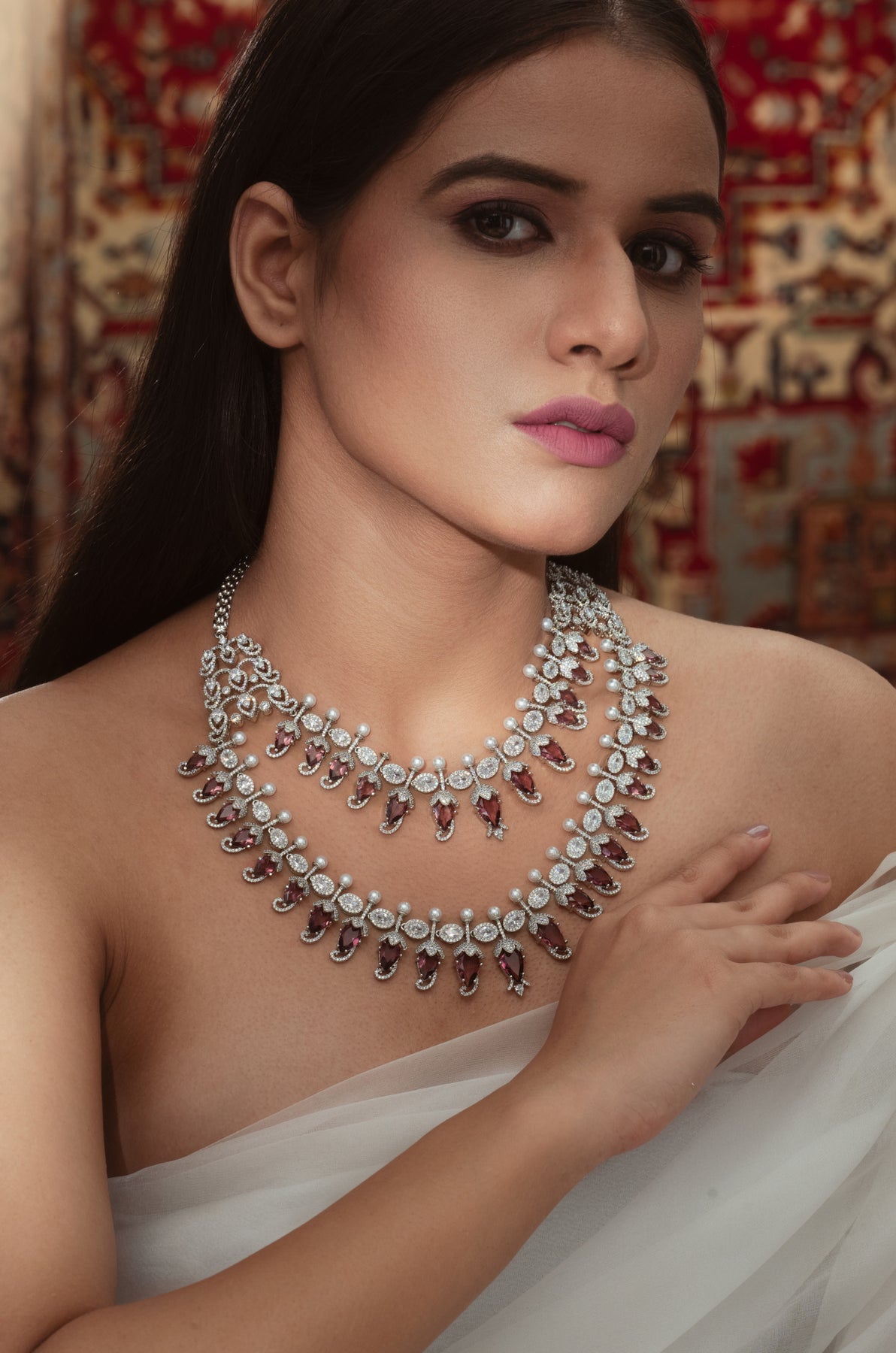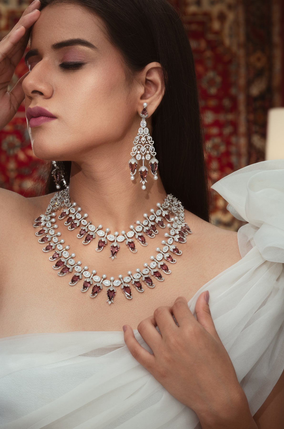 The Poppy necklace set is inspired by the delicate beauty of spring flower buds. This exquisite piece features charming flower bud motifs adorned with vibrant red stones, creating a captivating visual harmony. The elegant design is complemented by matching dangler earrings, making it the perfect accessory for any occasion.