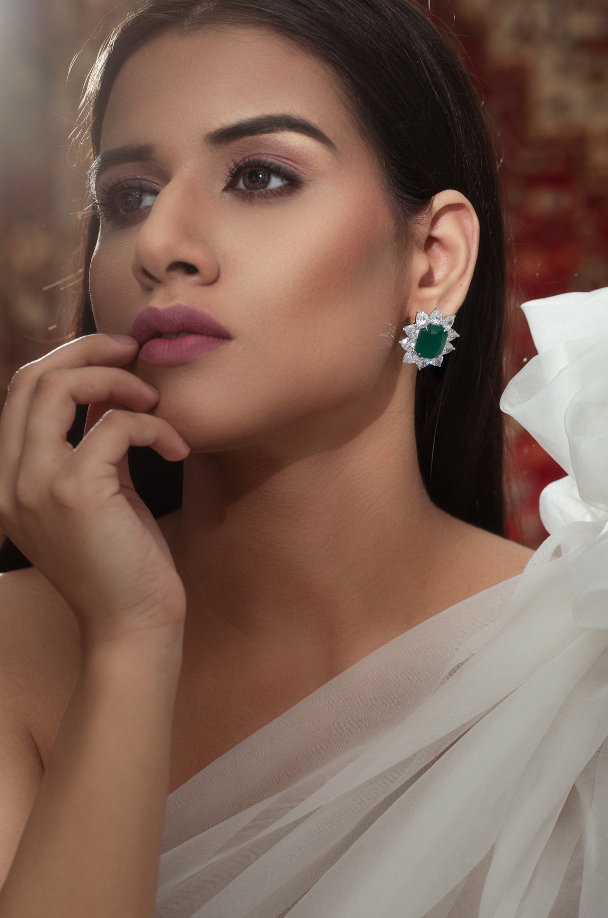 These classic earrings feature a unique floral stud design encrusted with sparkling white zirconia stones, with a pop of color from the center green stone. Stand out from the crowd with these fun and stylish earrings.