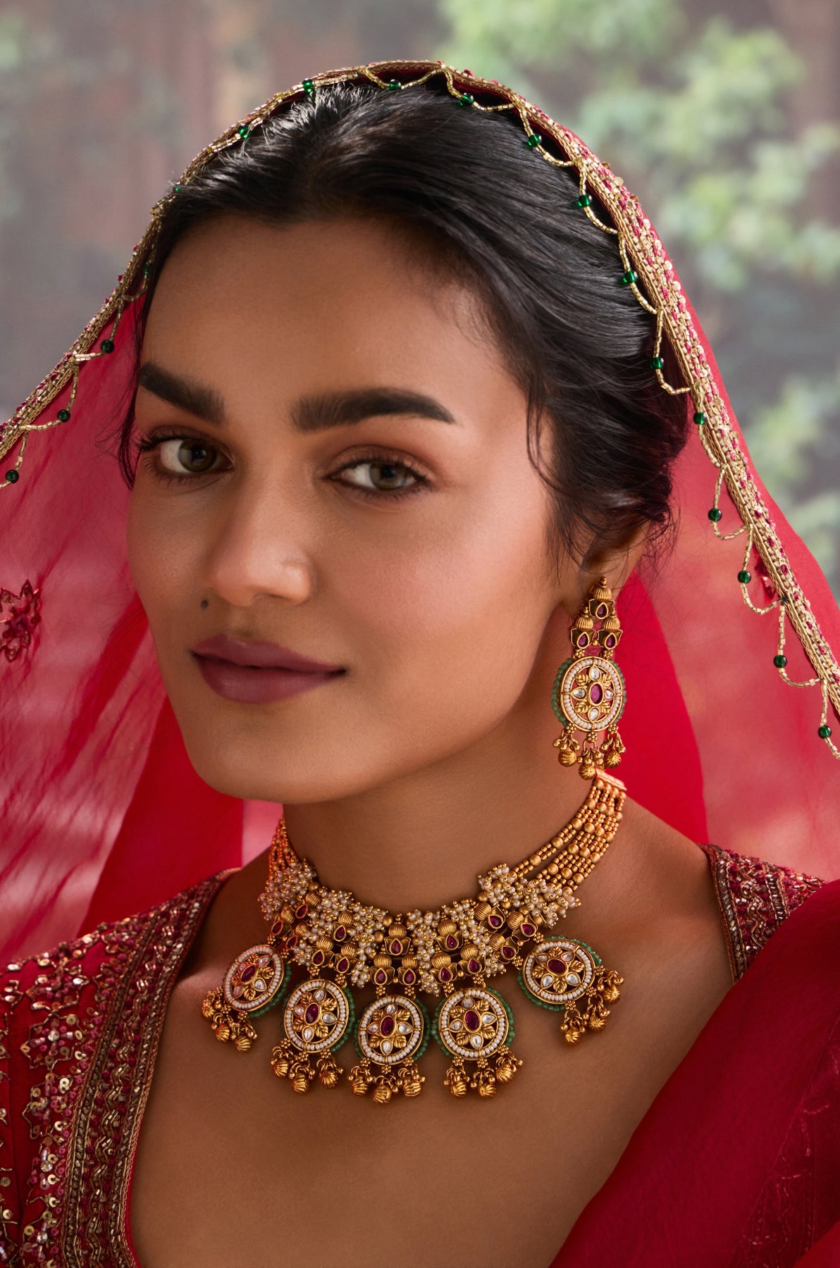 Introducing the Hemma necklace set, where timeless elegance meets spiritual grace. This enchanting piece draws inspiration from the grandeur of South Indian temples, featuring exquisite temple work embellished with lustrous pearls that catch the light beautifully. Each detail reflects authentic Indian heritage craftsmanship passed down through generations. The necklace arrives as a complete set with coordinating earrings, making it effortless to embrace traditional beauty.