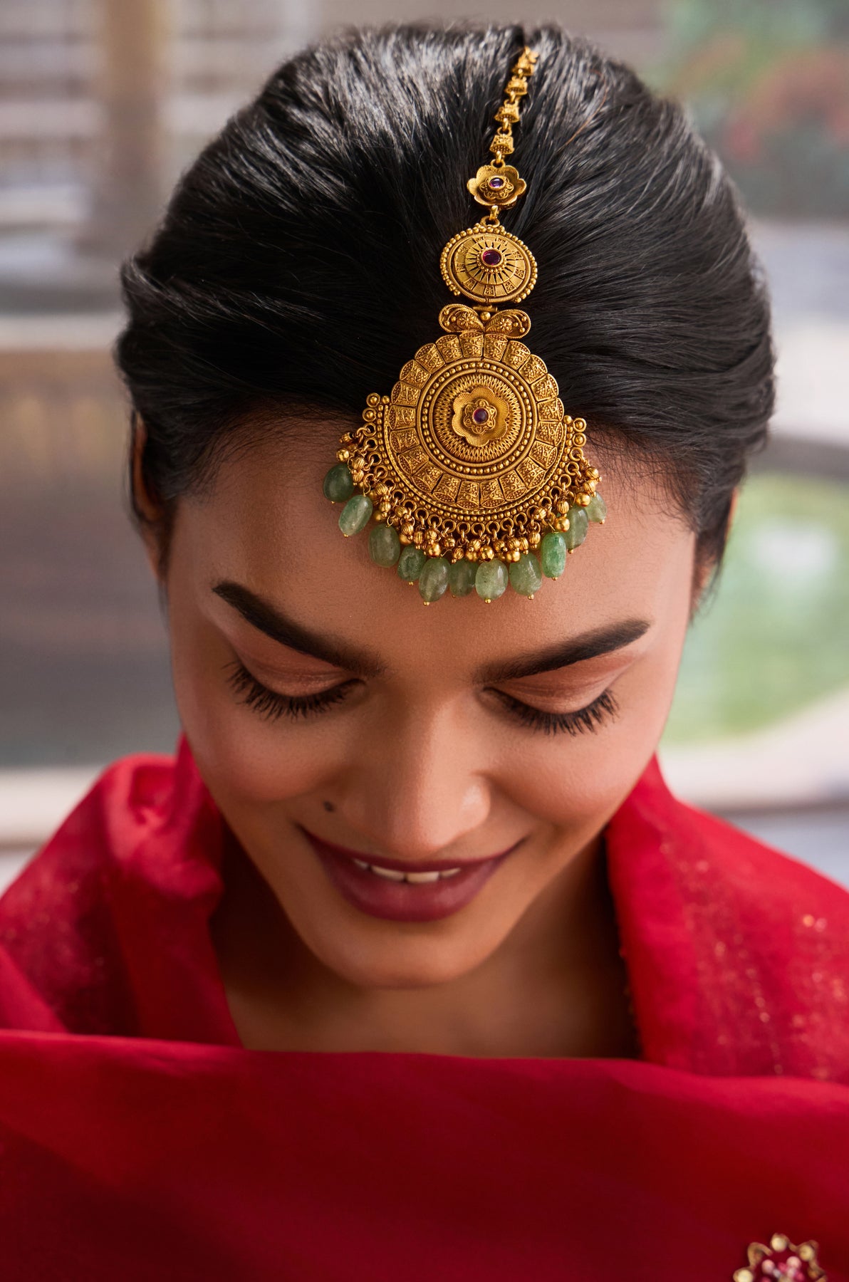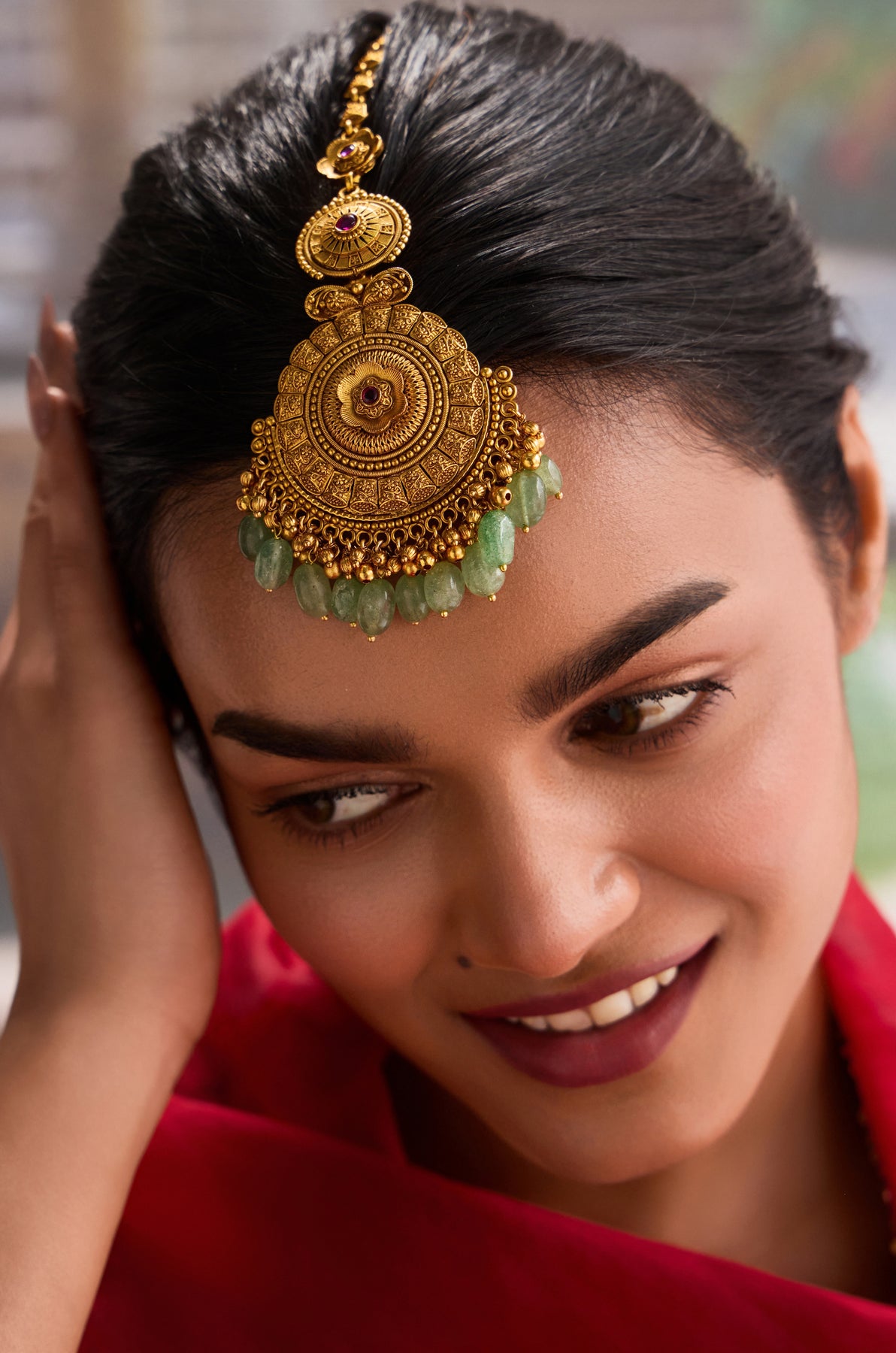 Adorn your center parting with a touch of divine elegance! This Jahanvi maangtikka draws inspiration from the intricate temple architecture of South India, where every curve tells a story of centuries-old craftsmanship. Handcrafted with meticulous attention to detail, it features shimmering fluorite stones that catch the light beautifully, paired with rich small golden balls trinkets that add warmth and character. Perfect for festivals, weddings, or when you want to channel your inner temple goddess. A playful nod to tradition that makes you feel absolutely radiant!