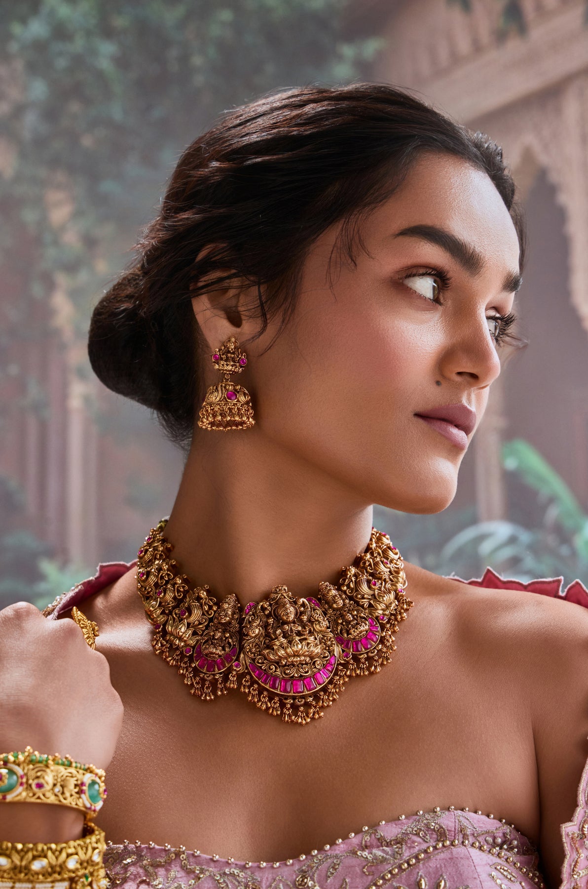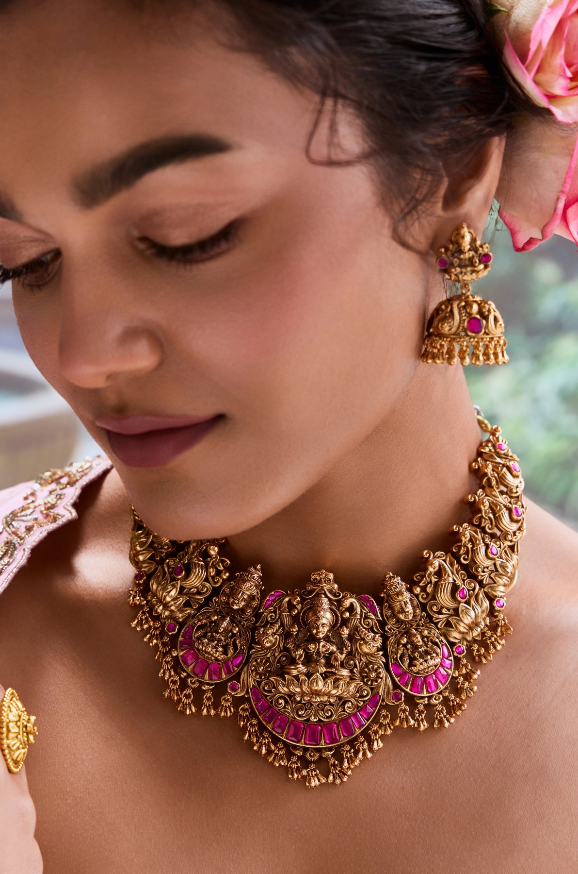 Celebrate divine beauty with this exquisite south Indian temple-inspired necklace set featuring the sacred Lakshmi motif. Crafted with meticulous attention to traditional artistry, this piece captures the essence of timeless elegance and spiritual grace. The ornate necklace is perfectly complemented by matching jhumka earrings that sway with every step, creating an enchanting symphony of style. Ideal for festivals, weddings, or whenever you want to channel goddess energy, this collection lets you wear your heritage with pride and panache. Absolutely divine!