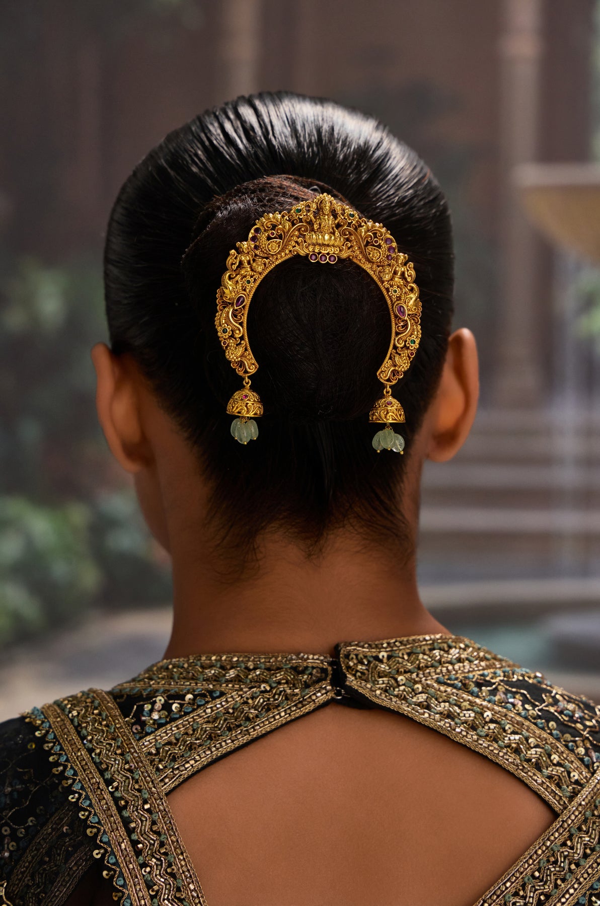 Celebrate your heritage with the Nisha braid pin, a stunning tribute to South Indian temple artistry and timeless tradition. Adorned with intricate temple-inspired detailing, this elegant juda pin secures your braids while honoring centuries of Indian craftsmanship. Perfect for festivals, weddings, or everyday elegance, it's a playful nod to cultural pride that transforms any hairstyle into a statement of grace. Wear your roots with style!