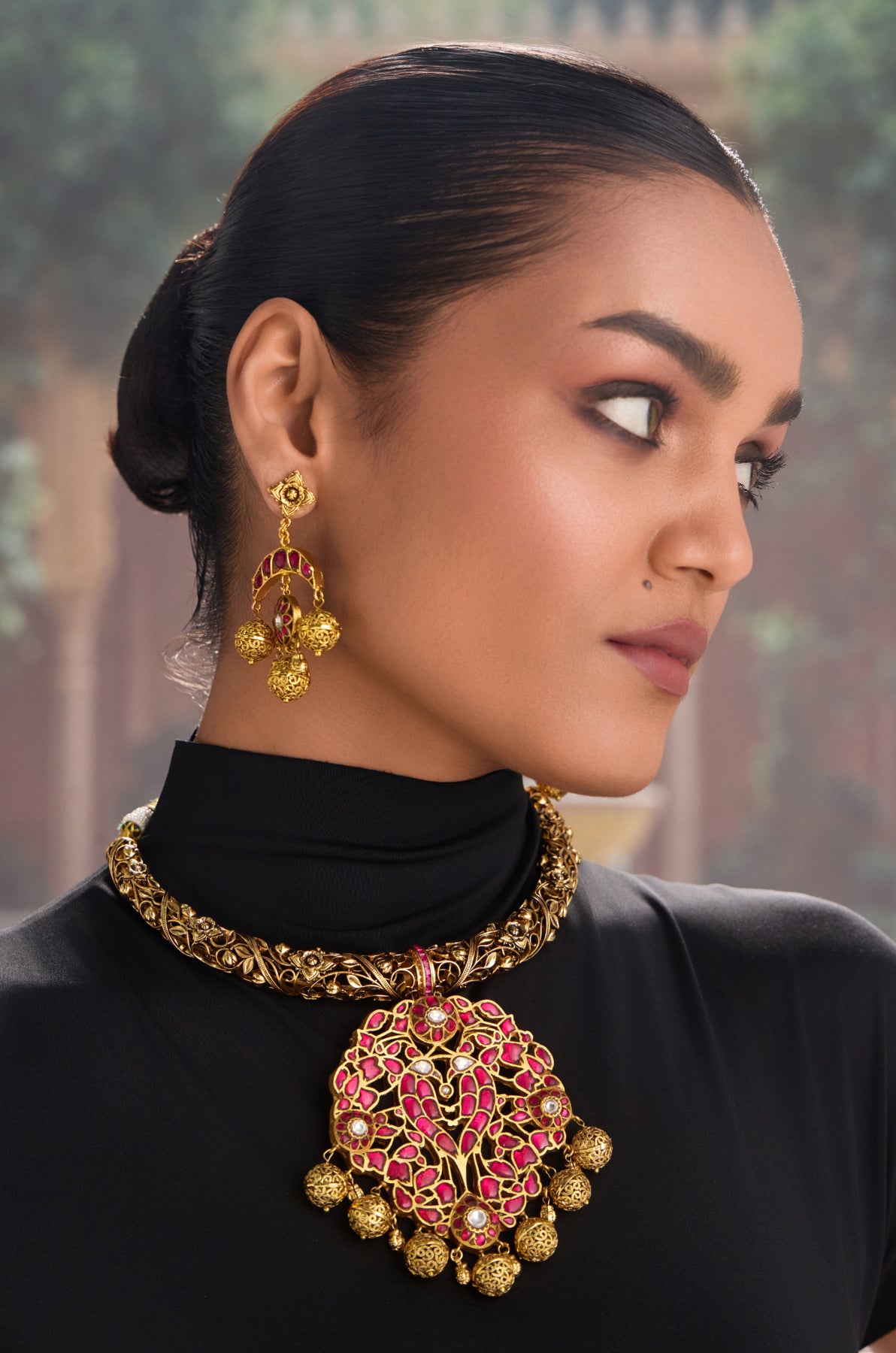 Celebrate timeless elegance with this stunning temple work hassli necklace, a cherished piece inspired by South Indian temple artistry. Crafted with meticulous attention to detail, this traditional pendant showcases authentic Indian craftsmanship that honors centuries-old design traditions. The hassli drapes beautifully around the neck, making a bold statement of cultural pride and sophistication. Complete your look by pairing it with the matching earrings for a coordinated, show-stopping ensemble. Perfect for festivals, weddings, or whenever you want to add a touch of heritage glamour to your style!