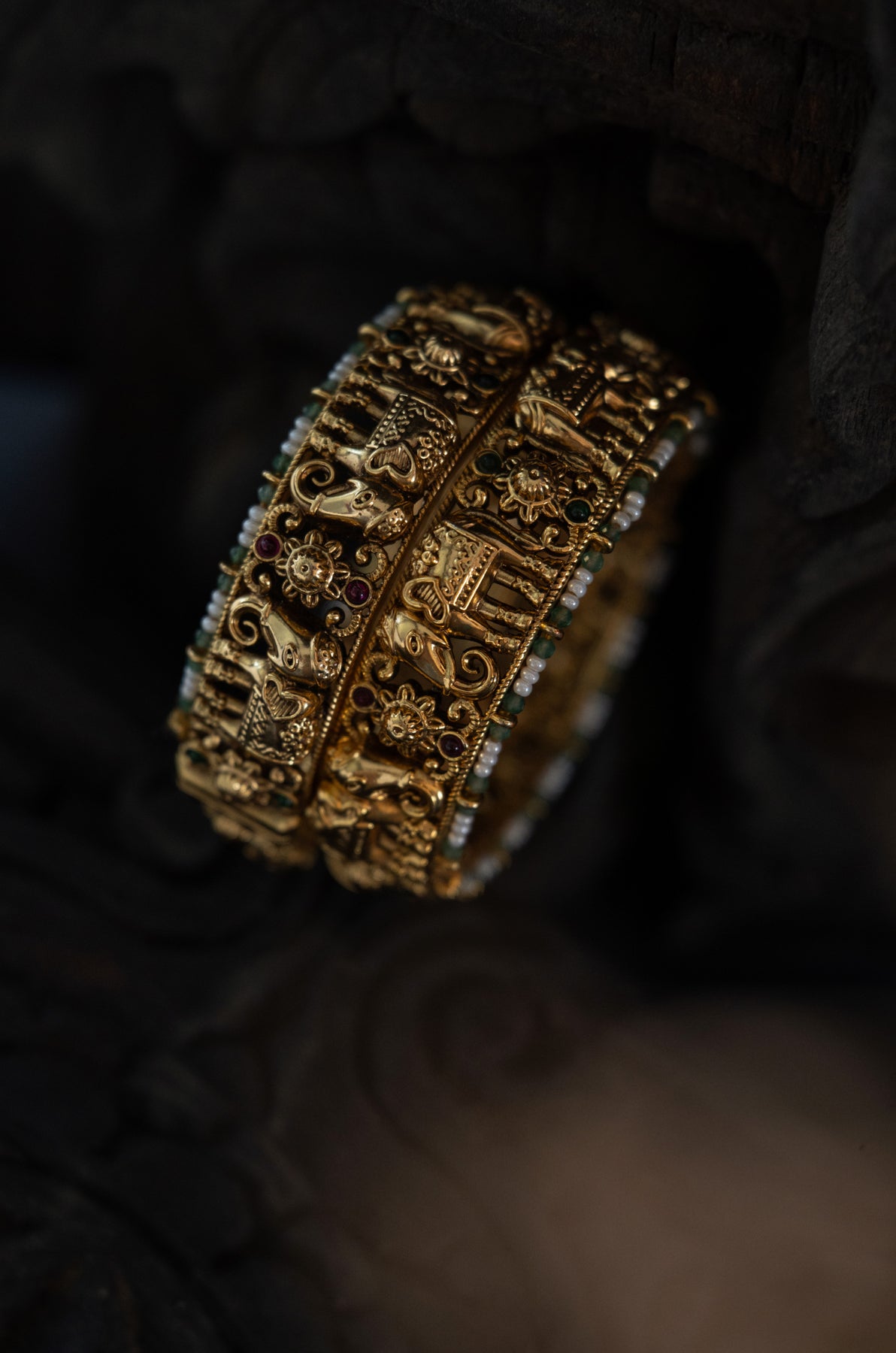 Adorn your wrists with a touch of timeless elegance! These Rohini bangles celebrate traditional South Indian craftsmanship with intricate details. Each bangle in this set of 2 features classic temple-inspired design, beautifully outlined with lustrous pearls and charming green trinkets that catch the light with every movement. Perfect for festivals, celebrations, or adding a dash of cultural flair to your everyday style. Embrace the grace of heritage jewelry that tells a story with every sparkle!