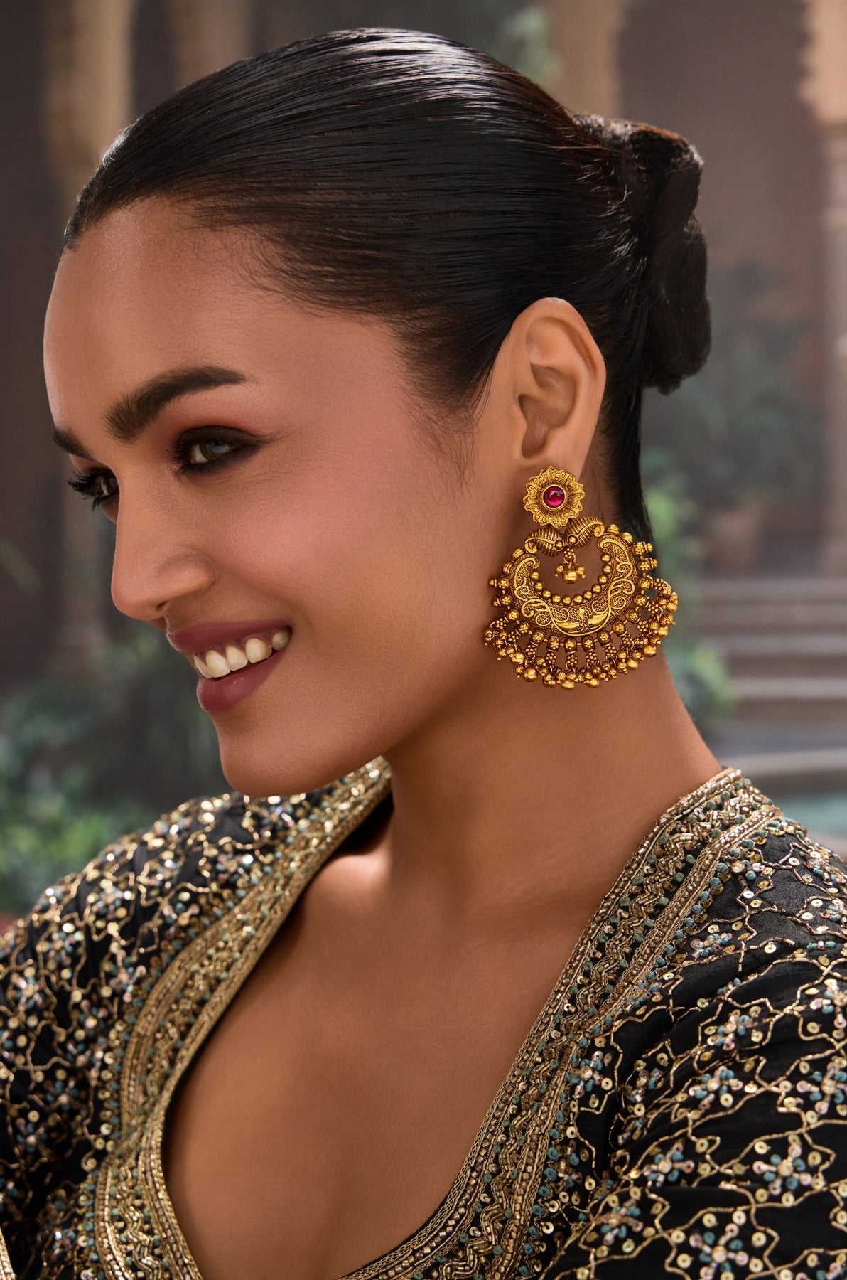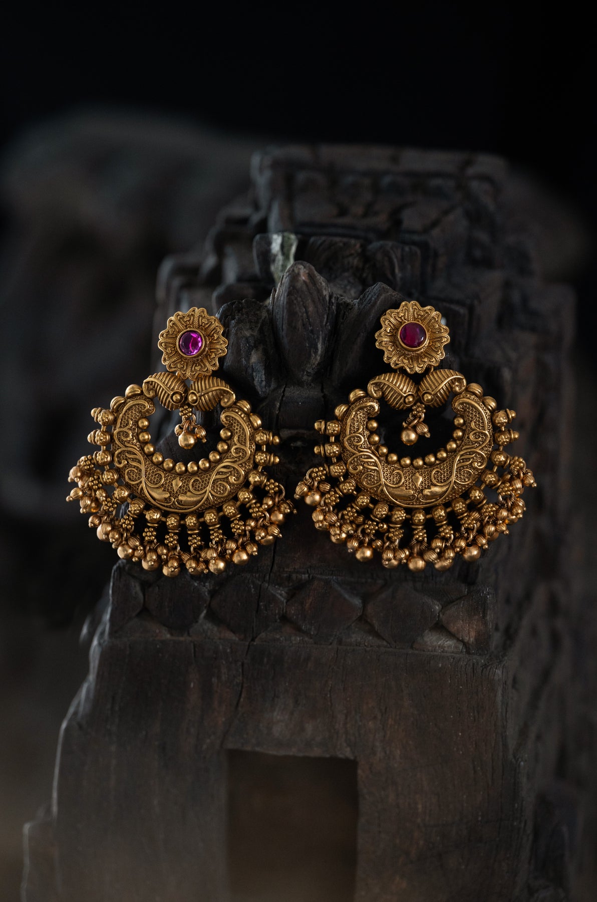 Discover the magic of Saanjh temple work chanbalis, where tradition meets playful elegance! These stunning chandbalis feature a gorgeous ruby-red stone crowning the design, paired with delicate golden gunghroo that dance with every movement. Inspired by sacred temple artistry, they're the perfect blend of regal sophistication and joyful charm. Whether you're celebrating a special occasion or elevating your everyday style, these earrings are your passport to timeless Indian beauty with a spirited twist!