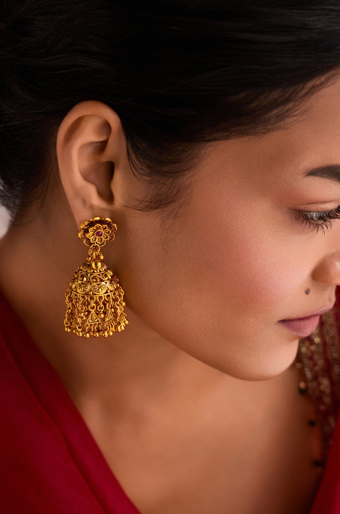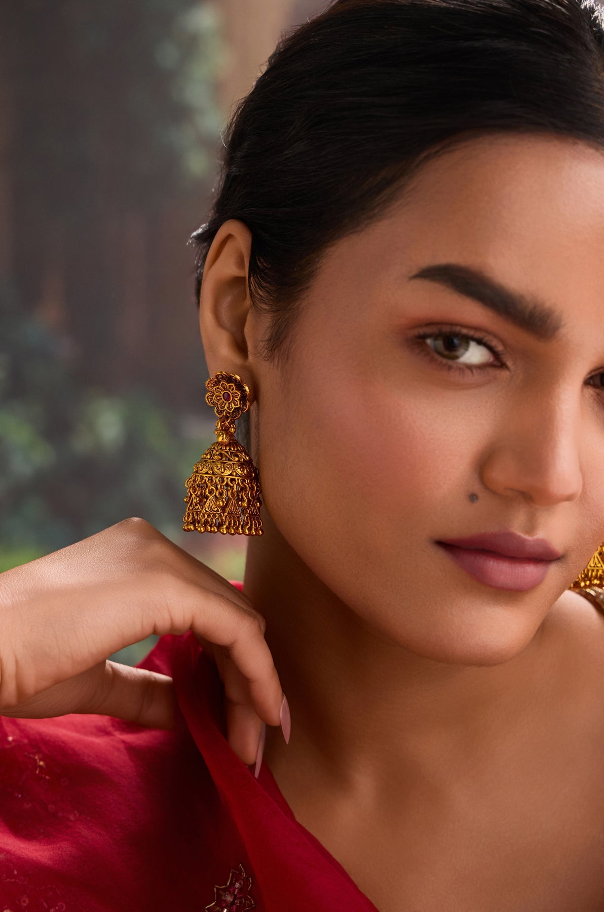 Step into the world of timeless South Indian temple artistry with the Sanjh jhumkas, where traditional craftsmanship meets modern flair! These beautifully detailed earrings feature exquisite temple work that pays homage to India's rich cultural legacy. With their ornate filigree designs and elegant swaying movement, they're the perfect companion for your special moments, whether it's a festive celebration or a wedding day. More than just accessories, these jhumkas are a playful nod to heritage that lets your personality sparkle with authentic Indian charm.