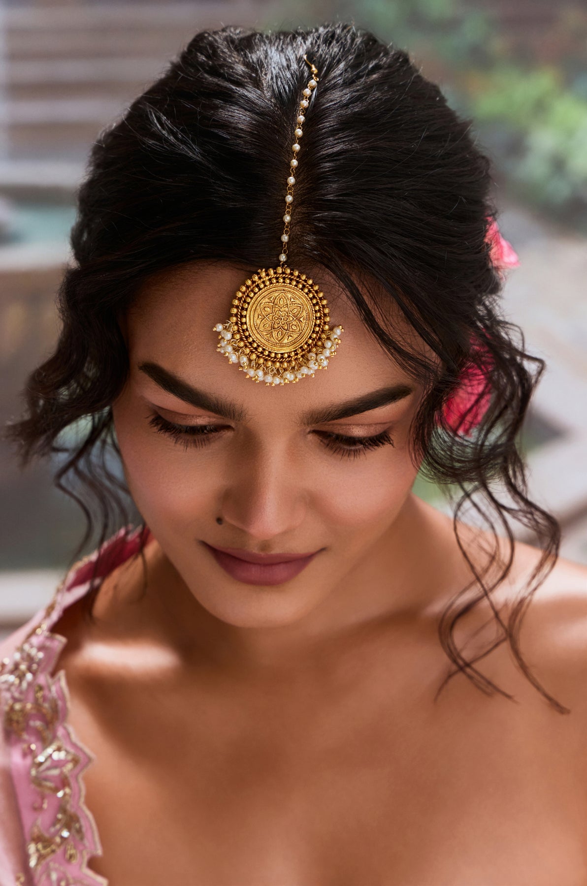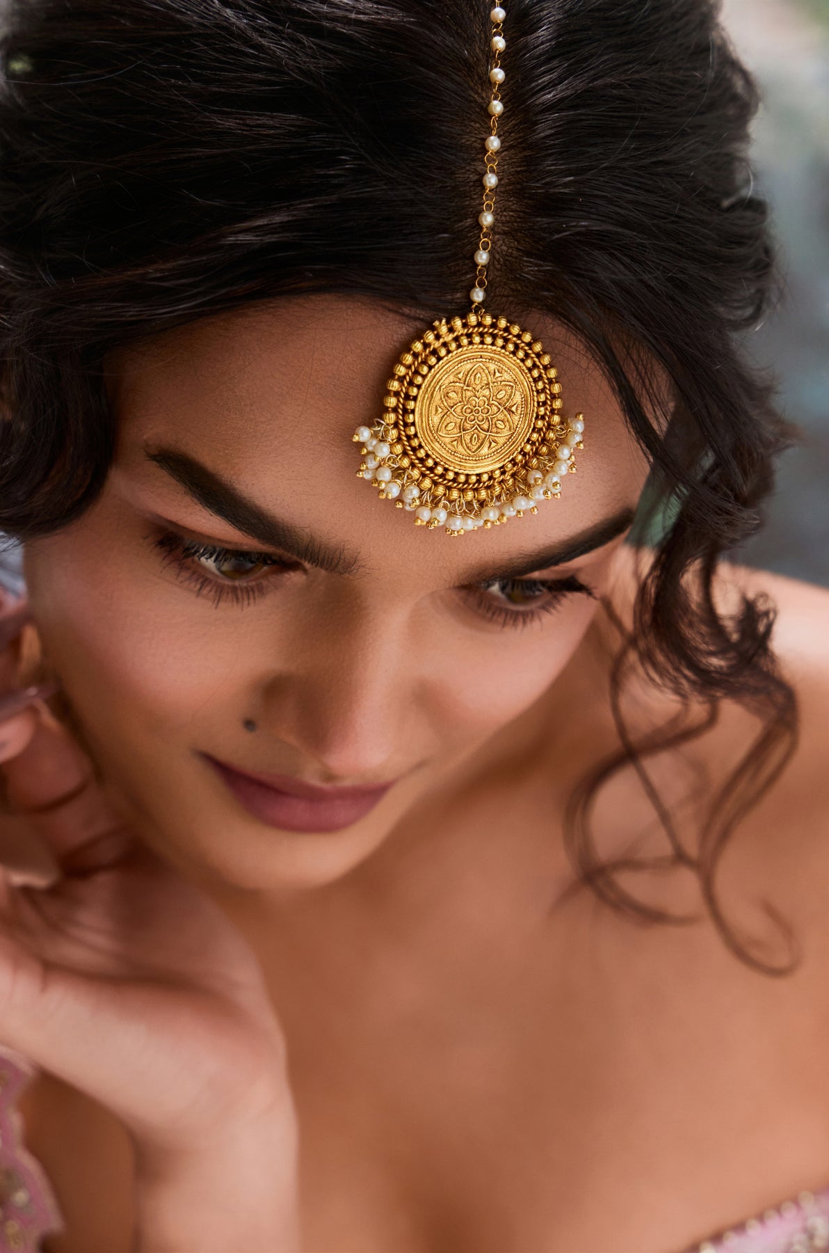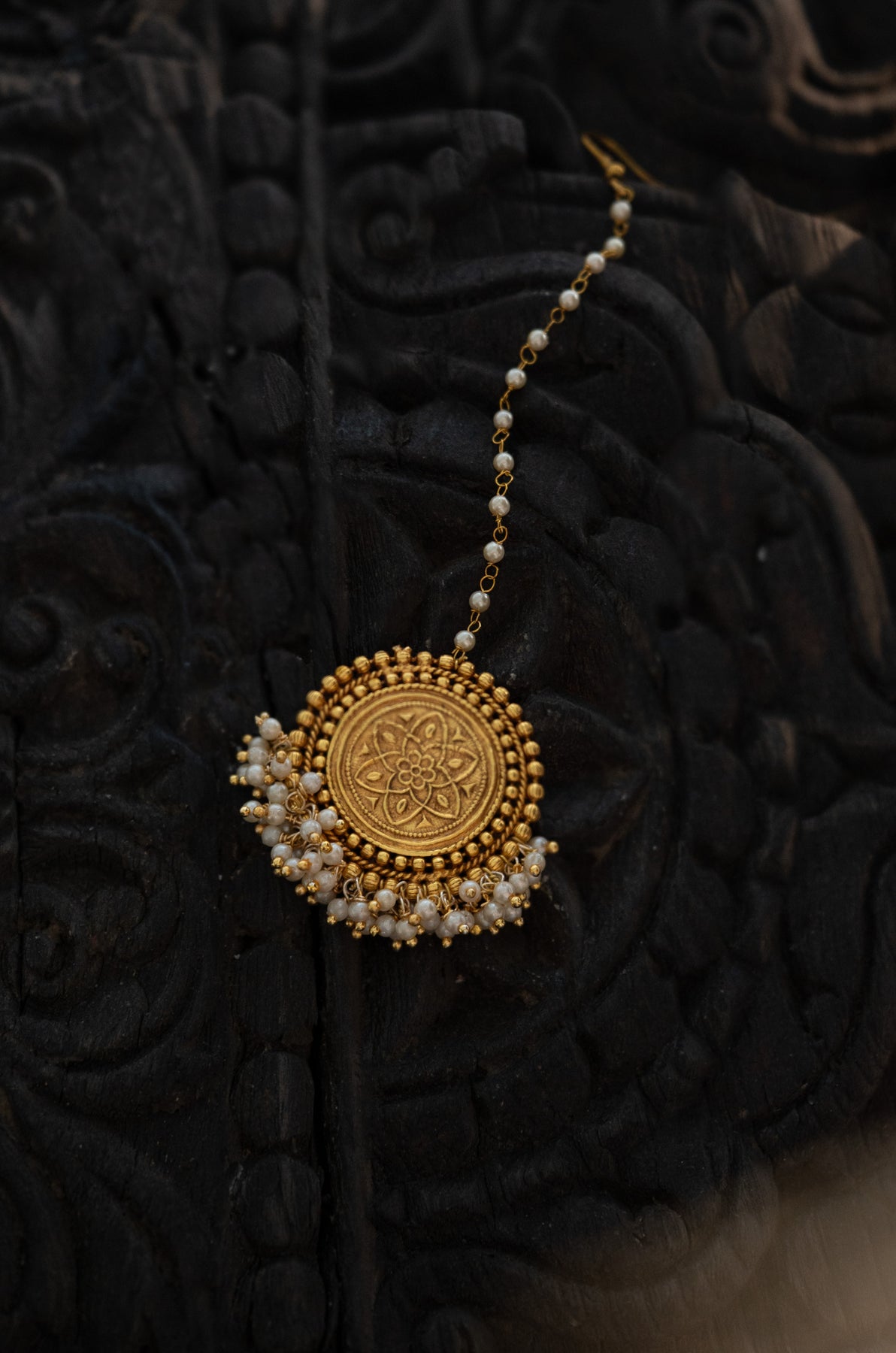 This Shweta maang tikka is your ticket to temple-inspired glamour! Intricate South Indian motifs are beautifully embedded throughout the design, while soft off-white shell pearls dangle from the bottom, creating a mesmerizing shimmer. Whether you're heading to a wedding or festival, this playful piece brings traditional artistry with a modern sparkle that'll have everyone asking where you got it.