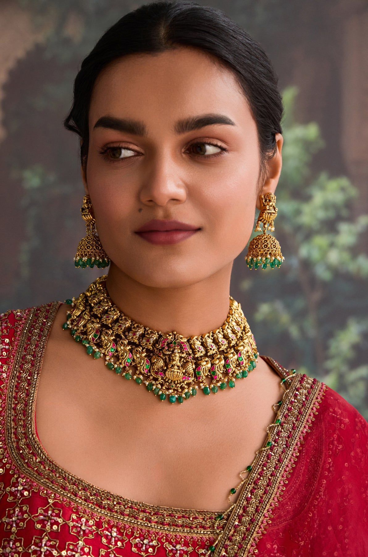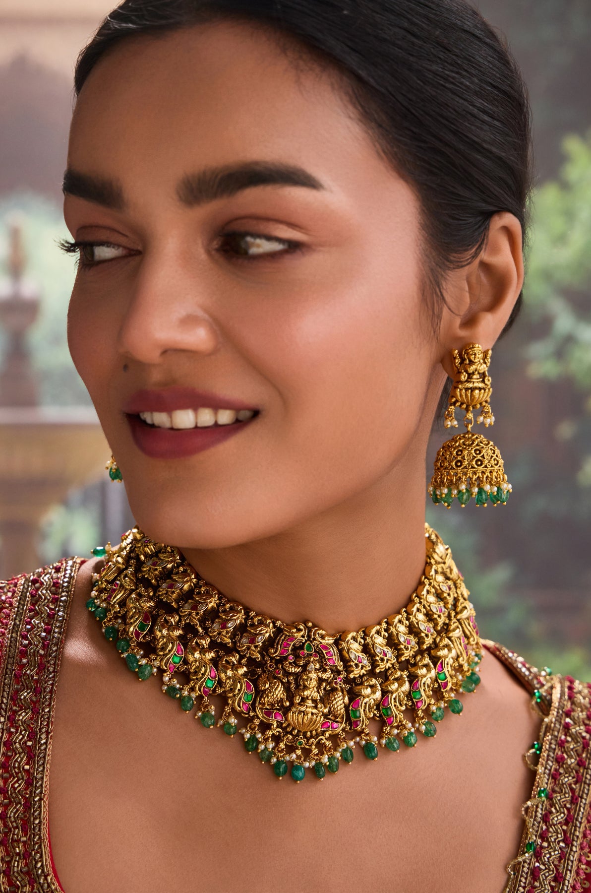 Celebrate your spiritual side with the Taara necklace Set, a stunning tribute to South Indian temple artistry. Crafted with traditional temple work techniques, this exquisite piece honors Indian heritage with intricate detailing and timeless elegance. The necklace comes beautifully paired with matching jhumka earrings, creating a complete, coordinated look that's perfect for festivals, weddings, or whenever you want to add a touch of cultural charm to your ensemble. Wear it with pride and let your inner goddess shine!
