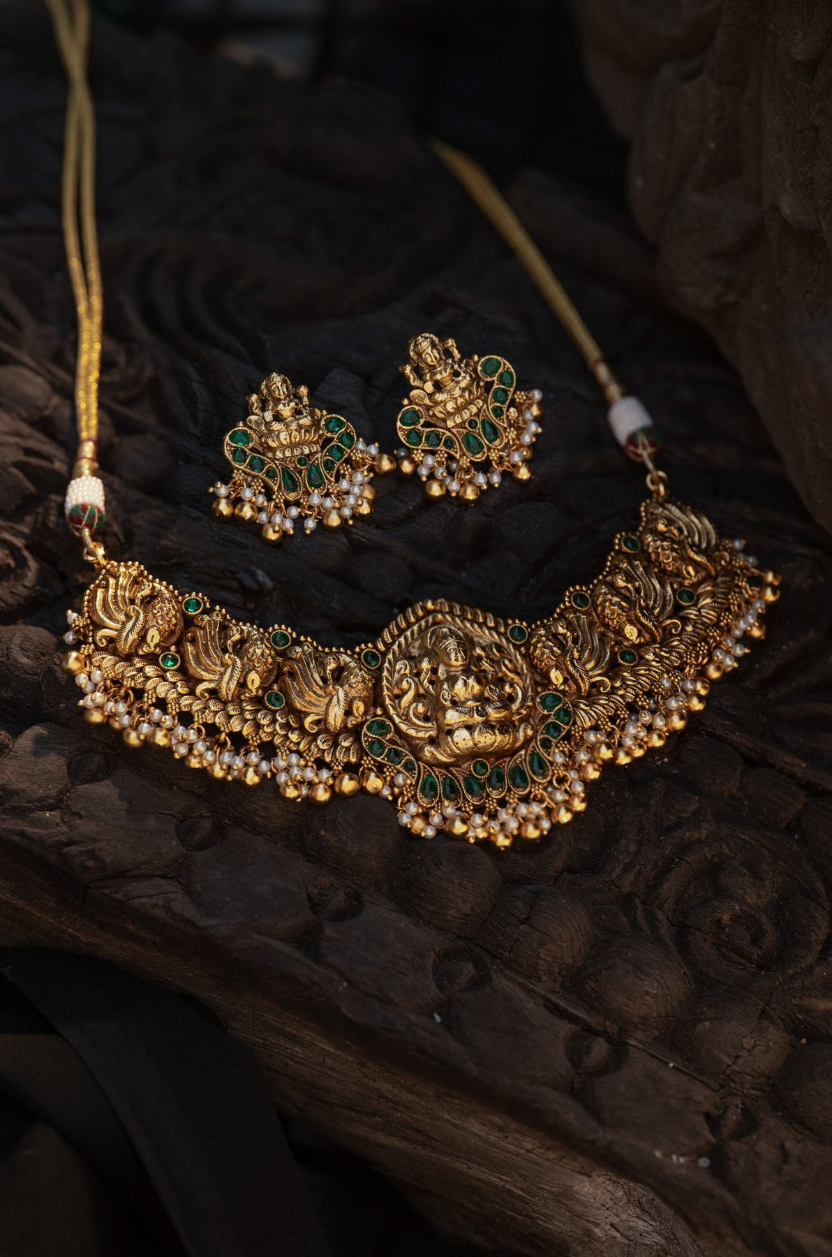 Step into timeless beauty with the Urvashi necklace set, where South Indian temple traditions meet playful modern style. This enchanting collection showcases intricate traditional temple work in gorgeous emerald hues, honoring centuries of Indian heritage craftsmanship. Complete with matching earrings, it's your go-to ensemble for celebrations, special occasions, or whenever you want to radiate cultural grace with a spirited edge. Embrace your roots and let your jewelry tell a story!