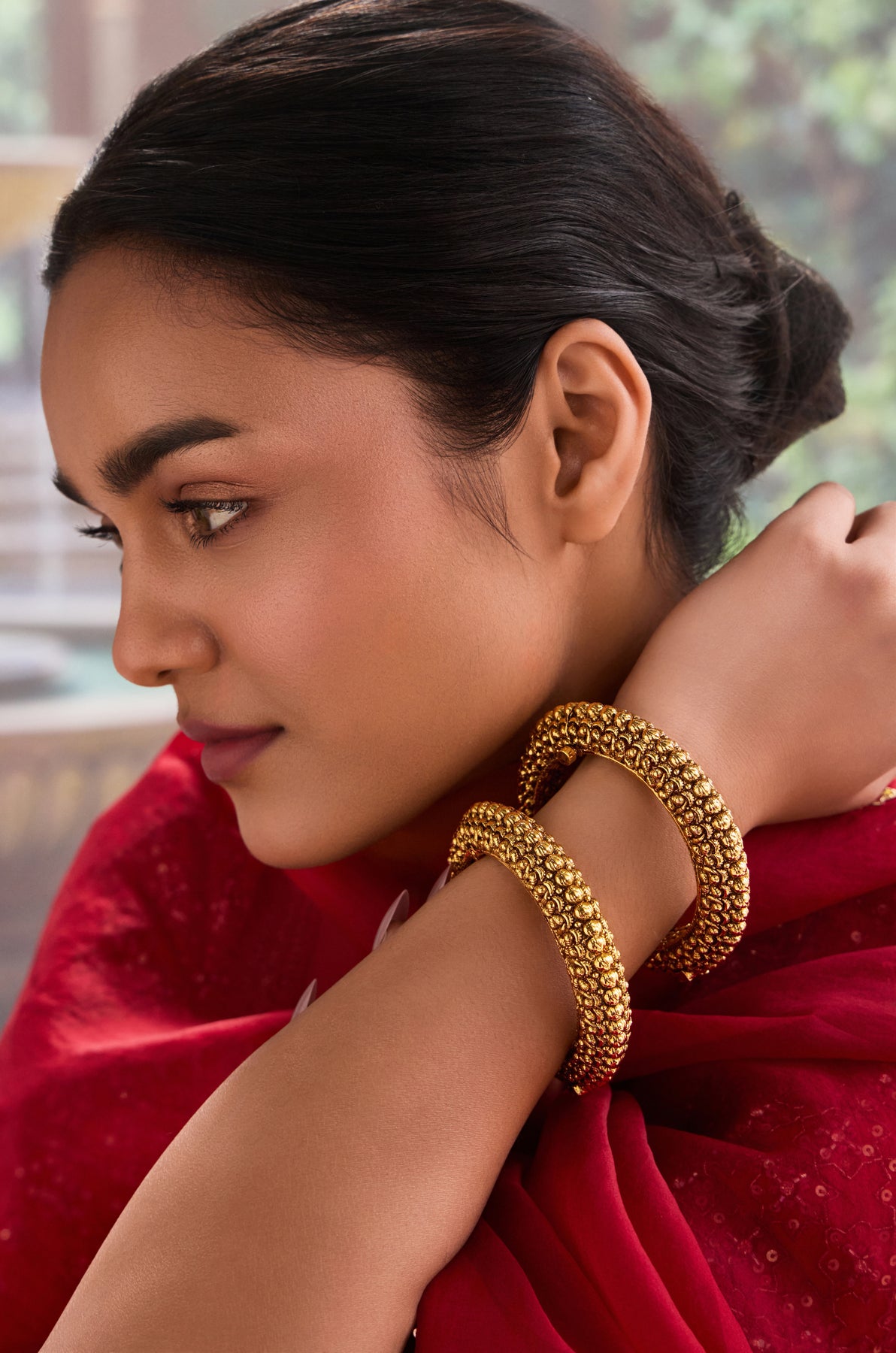 Adorn your wrists with timeless elegance! These Yamika bangles celebrate traditional craftsmanship with intricate detailing that whispers stories of heritage. Perfect for festivals, celebrations, or adding a touch of classic charm to everyday wear, this set of two brings authentic artistry to your jewelry collection. Each bangle showcases the meticulous temple work that makes these pieces truly special, a playful nod to tradition that never goes out of style!
