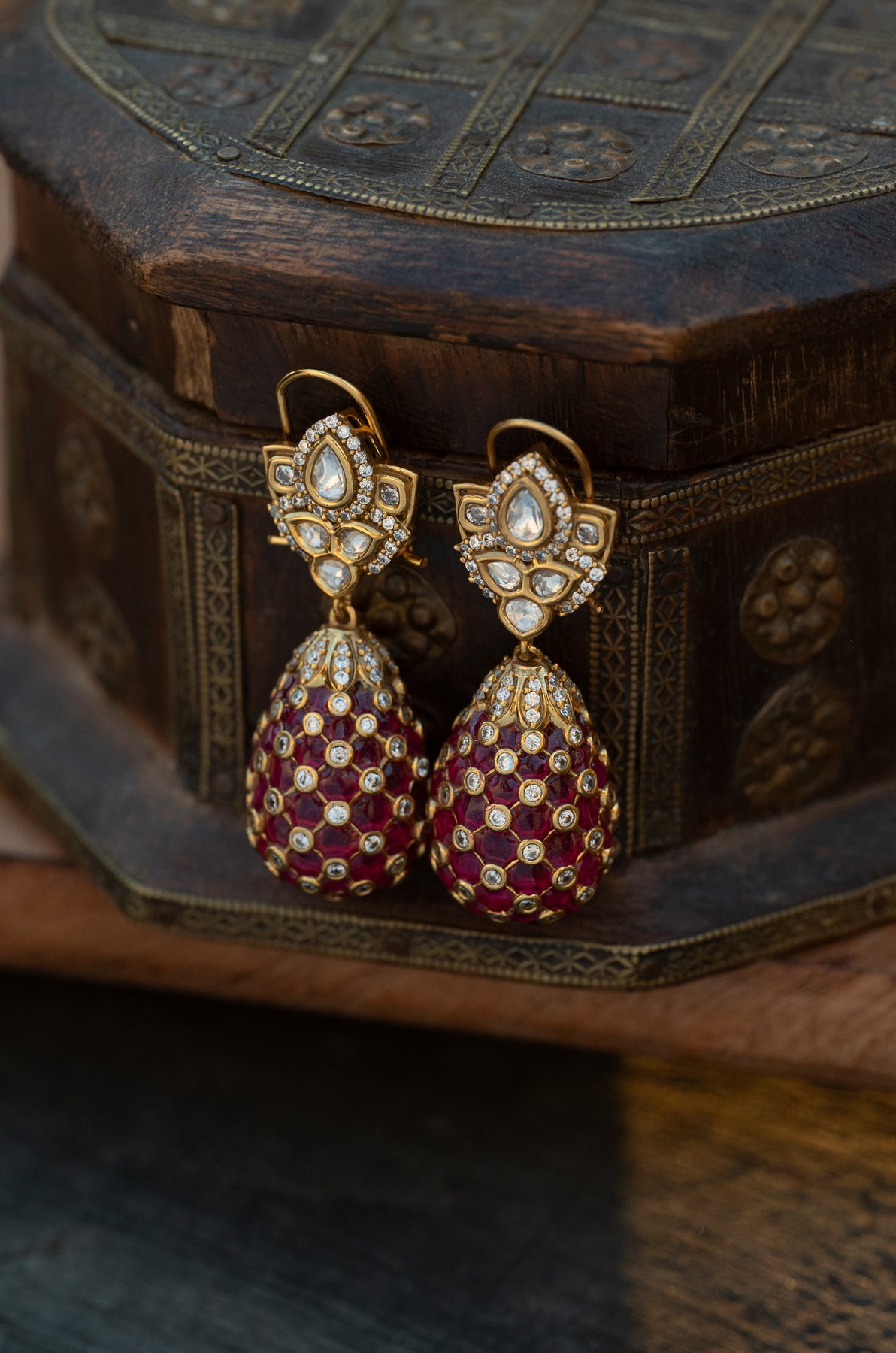 These striking earrings feature a delicate lotus-inspired top encrusted with uncut polkis, gracefully leading to a drop-shaped dangler packed with luscious ruby-red stones and shimmering kundan work. The bold silhouette is perfectly balanced by its compact elegance, ideal for when you want to make a statement without shouting.