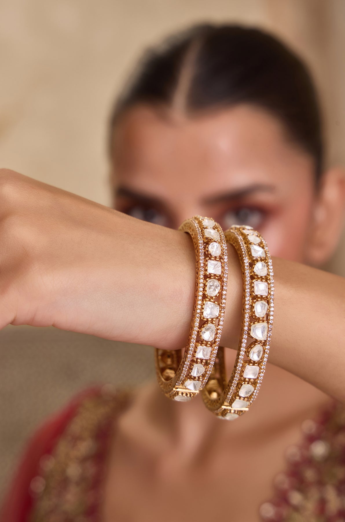A majestic creation inspired by the grandeur of royal courts. These broad gold-toned bangles are encrusted with rectangular polkis, each perfectly spaced and bordered with intricate detailing that reflects exquisite craftsmanship. The inner band features textured gold work, adding depth and luxury to the design. Bold, elegant, and timeless, the Henna bangles are made for bridal finery, grand celebrations, or anyone looking to make a commanding yet graceful statement.