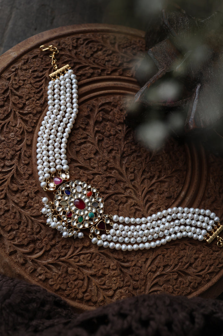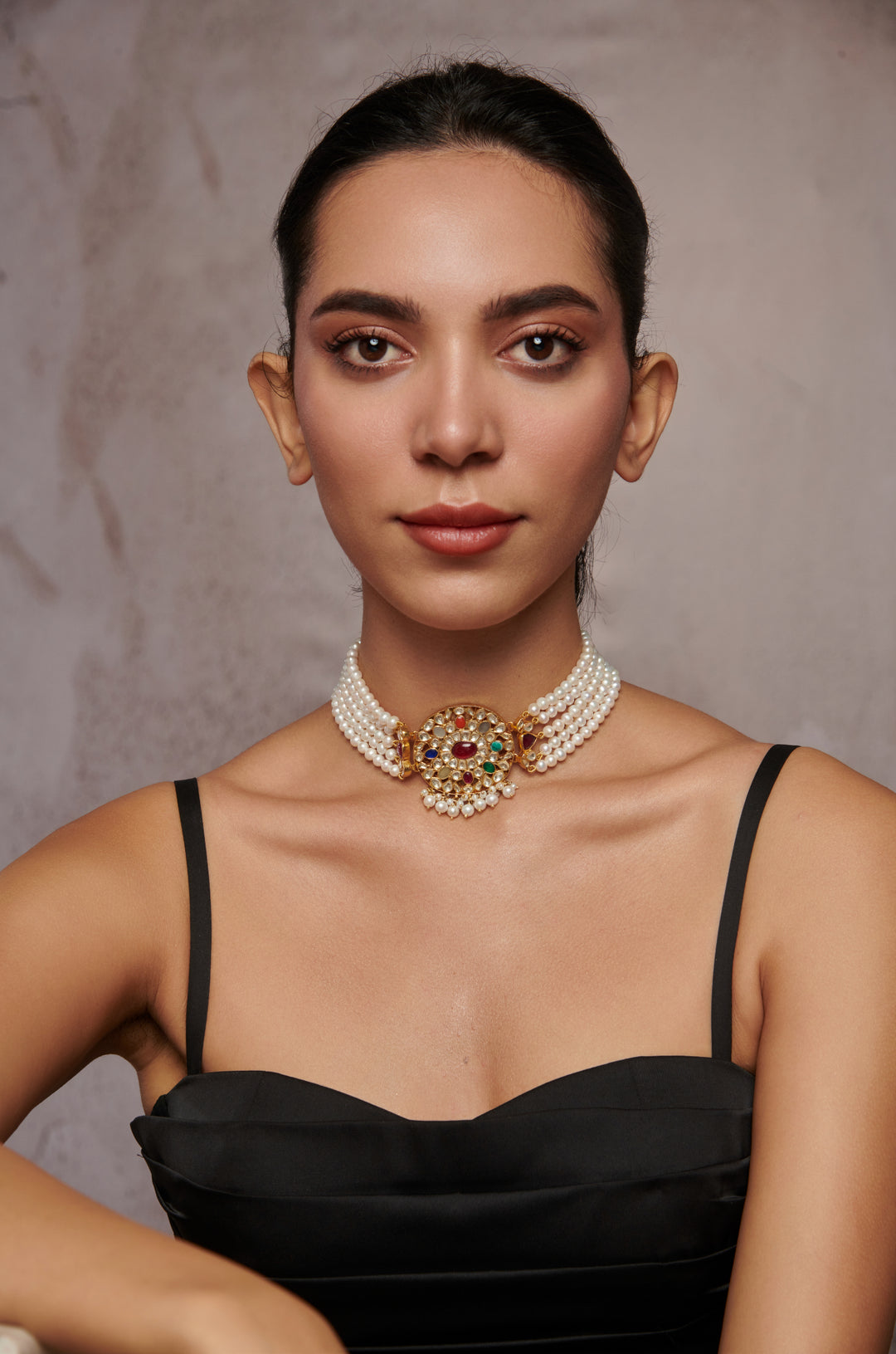 A melodious blend of radiant polkis and navrattan stones come together in an exquisite pearl entwined choker necklace that sits well on your neck to give a touch of timelessness to your look. Our Adeza choker is a one-of-kind necklace that is designed to pay tribute to the masterstroke craftsmanship by recreating the age-old history of Indian jewelry for generations to come.