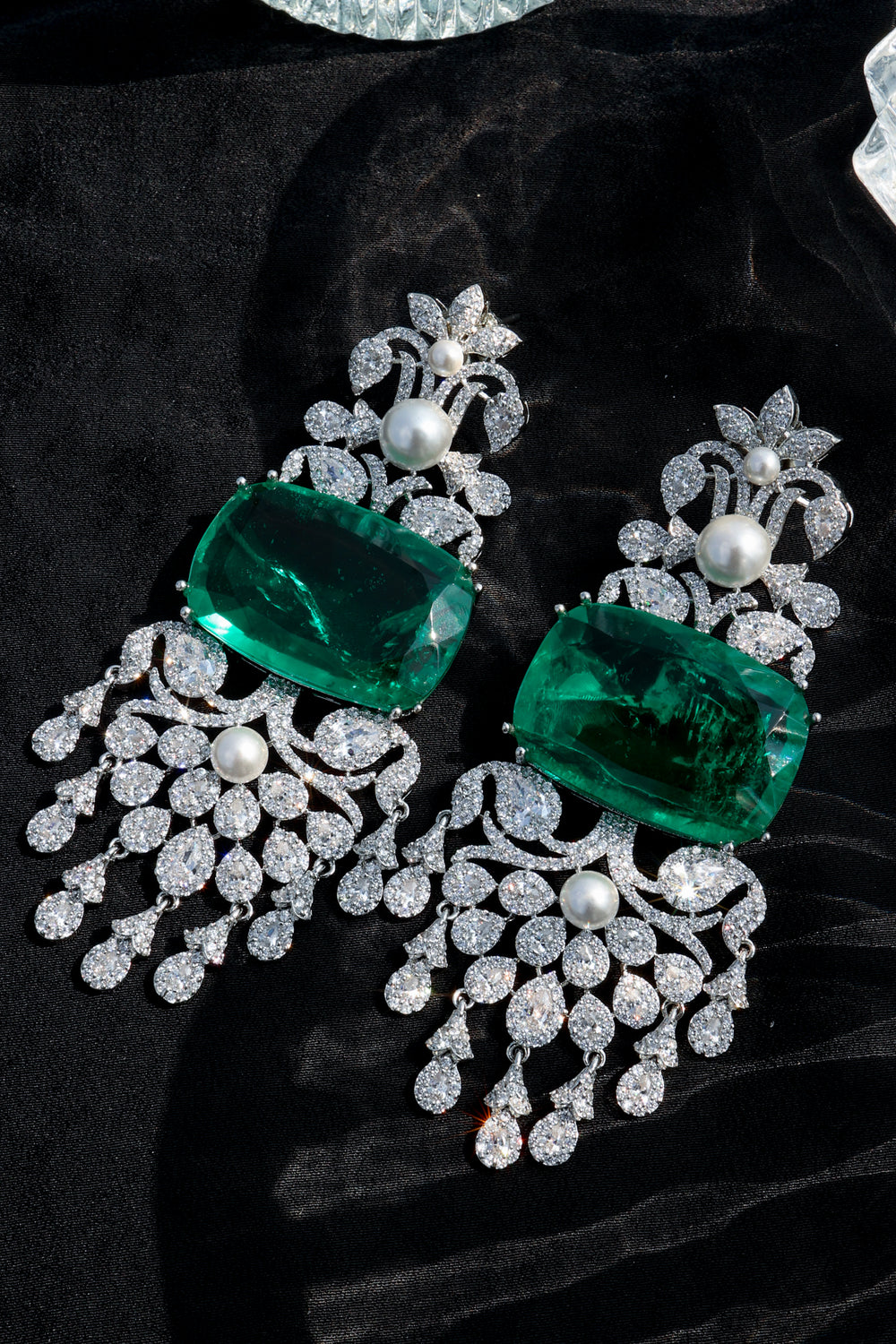 Elevate your look with these stunning statement earrings, encrusted with shimmering cubic zirconia and adorned with vibrant emerald green crystals. The design is further enhanced by lustrous pearls, creating a perfect fusion of modern flair and classic elegance. These earrings are the ultimate accessory for adding a touch of glamour and sophistication to any ensemble.